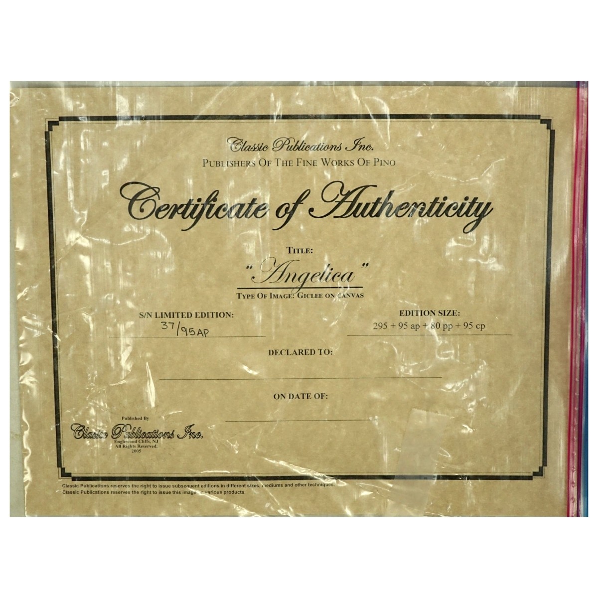 Pino (1939 - 2010) Limited Edition Giclee on Canvas "Angelica" Signed and Numbered 37/95AP. Classic Publication Inc. COA included. Measures 40" H x 24" W, frame measures 53-1/2" H x 37-3/8" W. Domestic Shipping: Third party Min Est. $1200.00 Max Est. $1500.00