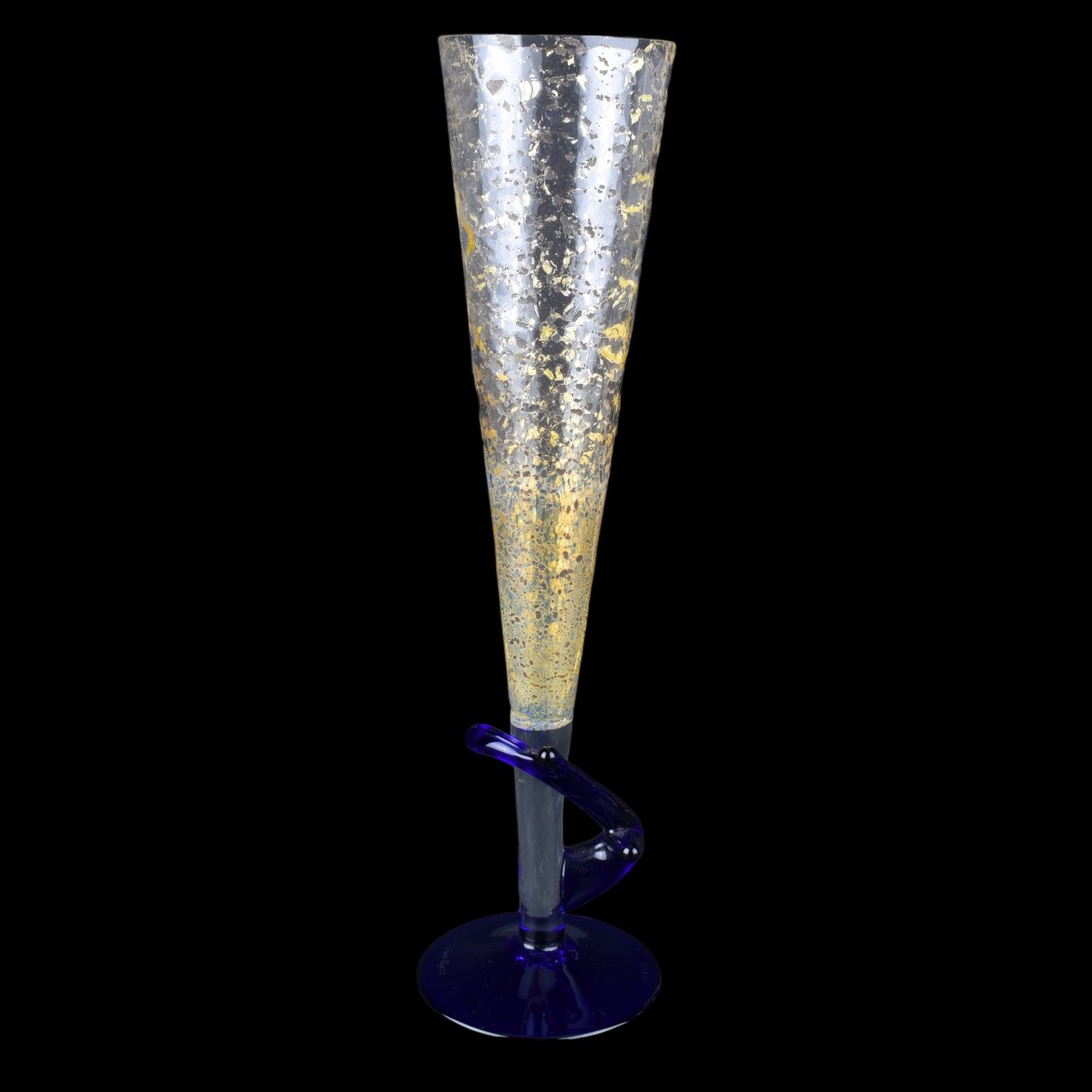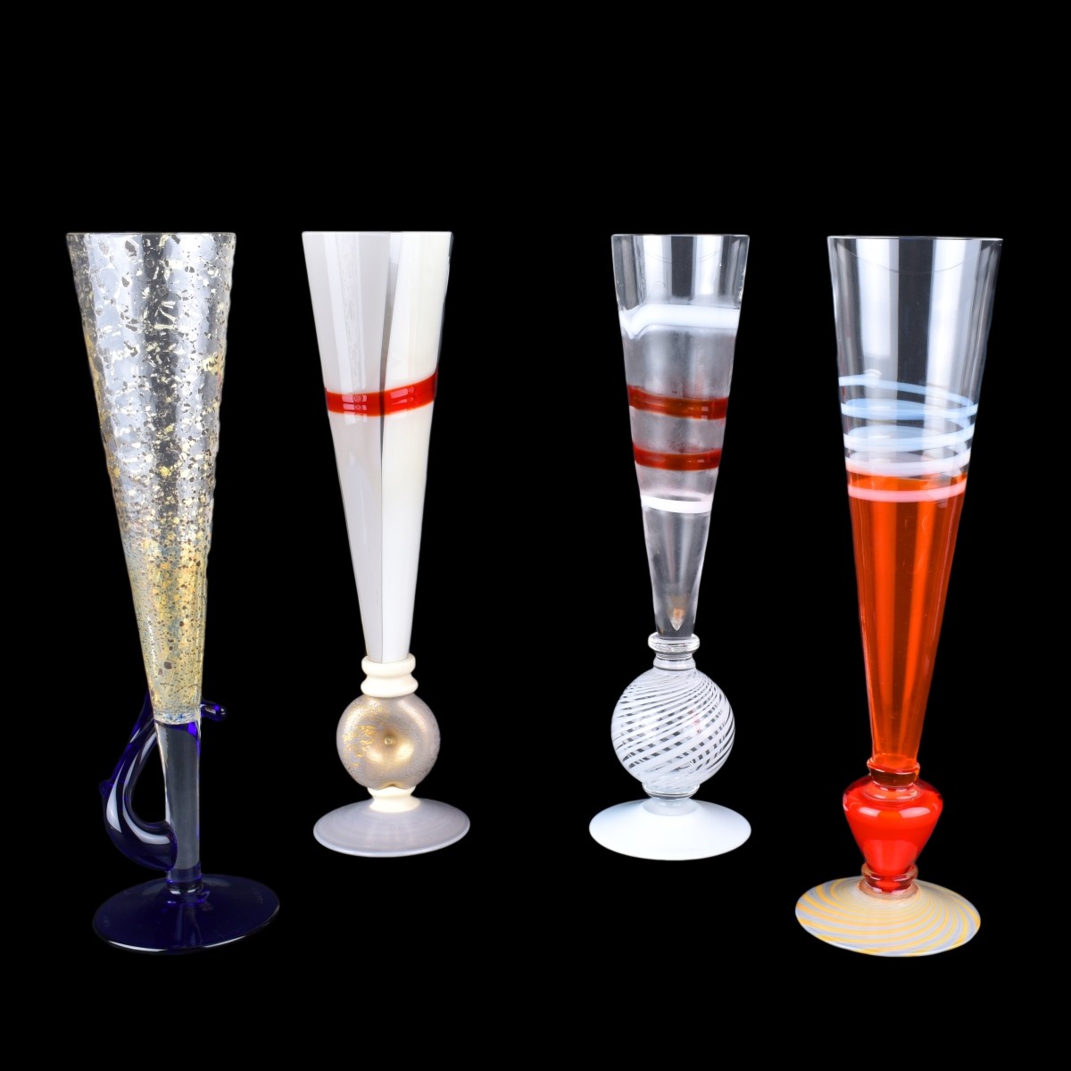 Four (4) Carlo Moretti, Italian (20th C.) Tall Art Glass Champagne Flutes. Signed. Each in various colored patterns. Measures 10-3/4" H. Domestic Shipping: $72.00 Min Est. $600.00 Max Est. $800.00