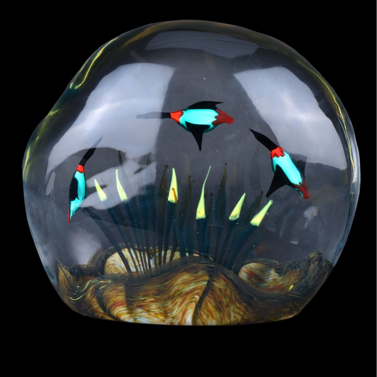 Large Italian Art Glass Bird Sculpture. Unsigned. Depicts birds in flight. Measures 10" H x 11-1/4" W. Domestic Shipping: $88.00 Min Est. $300.00 Max Est. $500.00