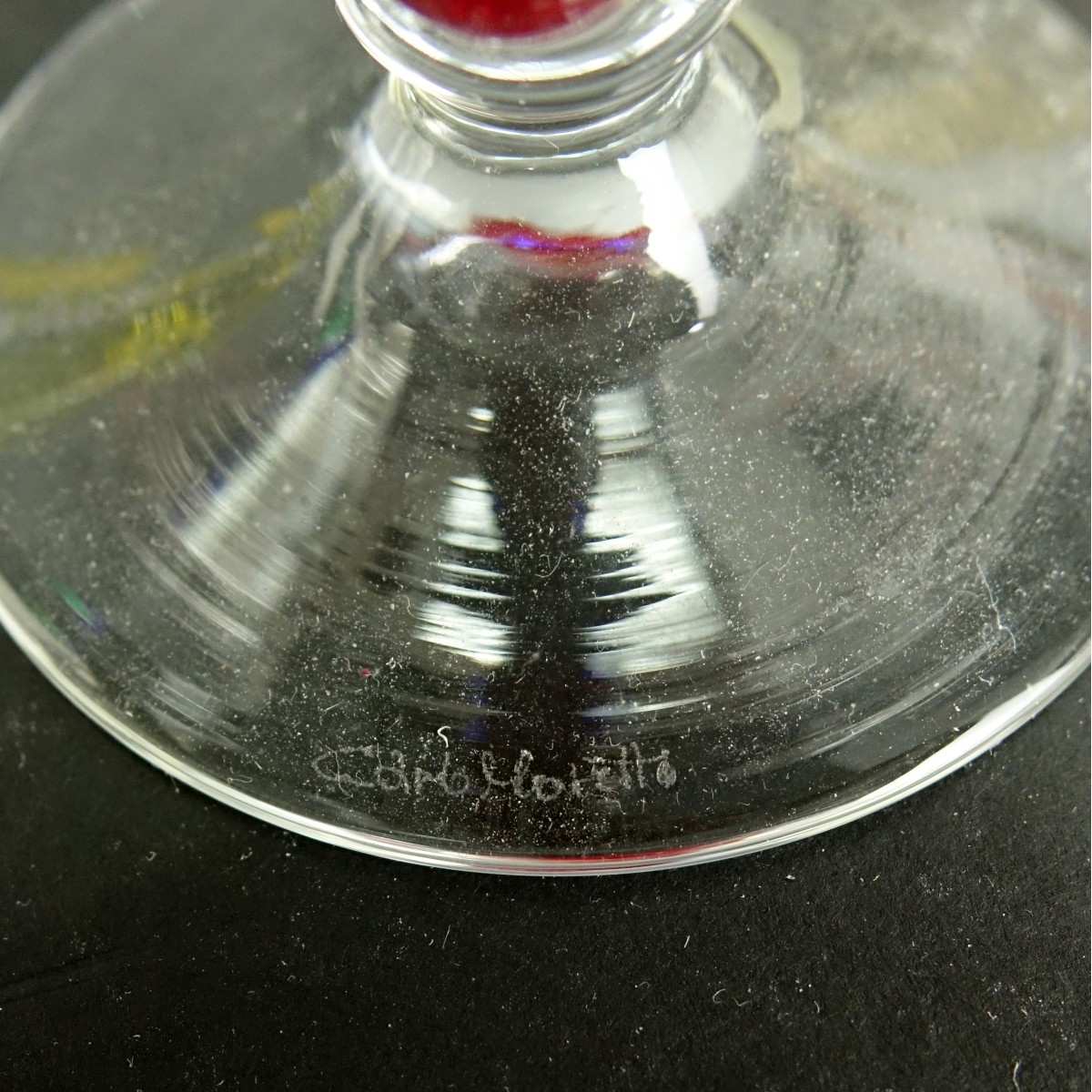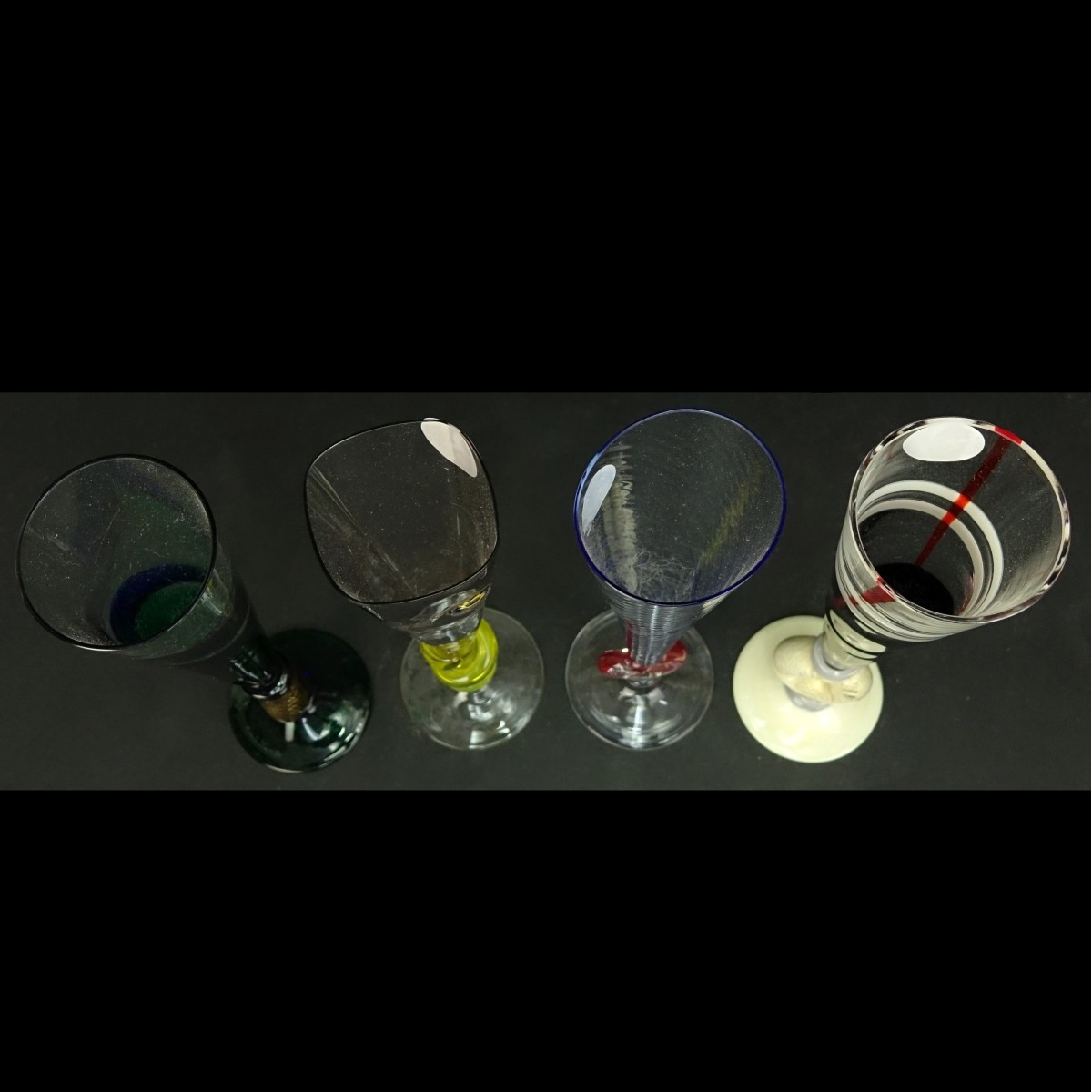 Four (4) Carlo Moretti, Italian (20th C.) Tall Art Glass Champagne Flutes. Signed. Each in various colored patterns. Measures 10-3/4" H. Domestic Shipping: $72.00 Min Est. $600.00 Max Est. $800.00