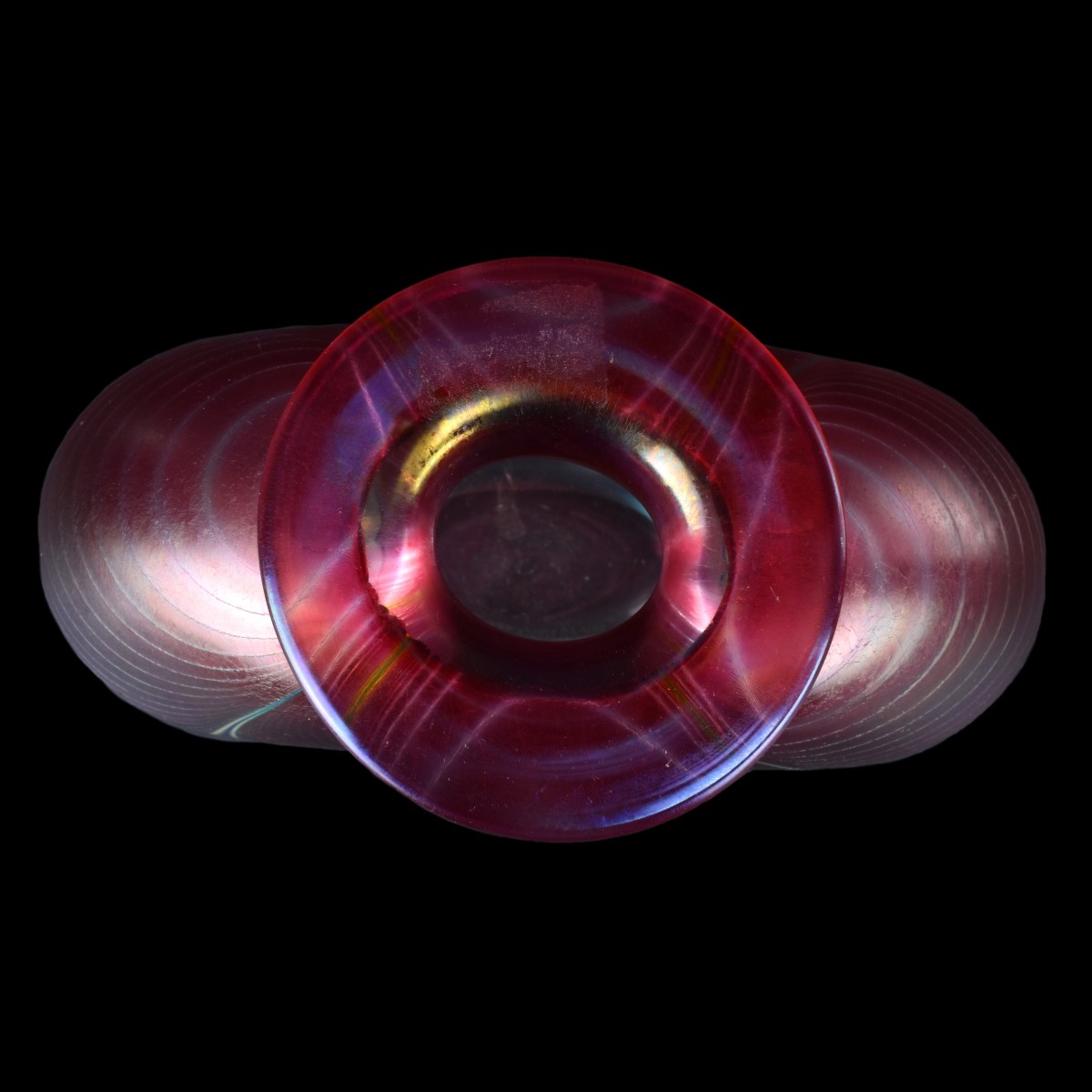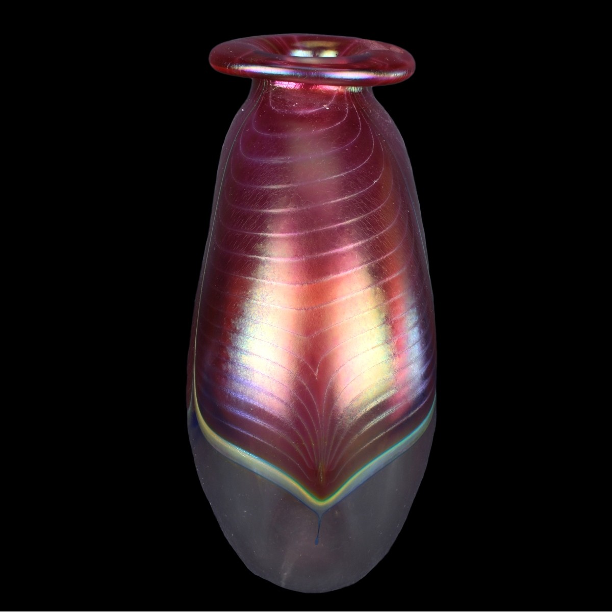 Stuart Abelman Art Glass Pulled Feather Vase. Signed, numbered, and dated 1985. Measures 8-1/4" H x 8-1/2" W. Domestic Shipping: $66.00 Min Est. $200.00 Max Est. $250.00