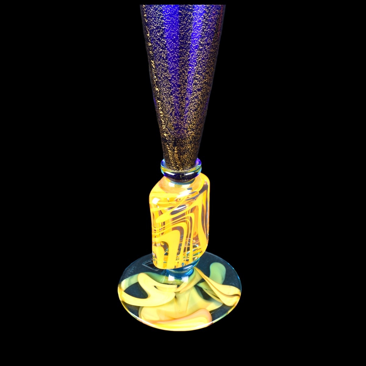 Five (5) Carlo Moretti, Italian (20th C.) Tall Art Glass Champagne Flutes. Signed, three with original stickers attached. Each in various colored patterns. Measures 10-3/4" H. Domestic Shipping: $85.00 Min Est. $600.00 Max Est. $800.00