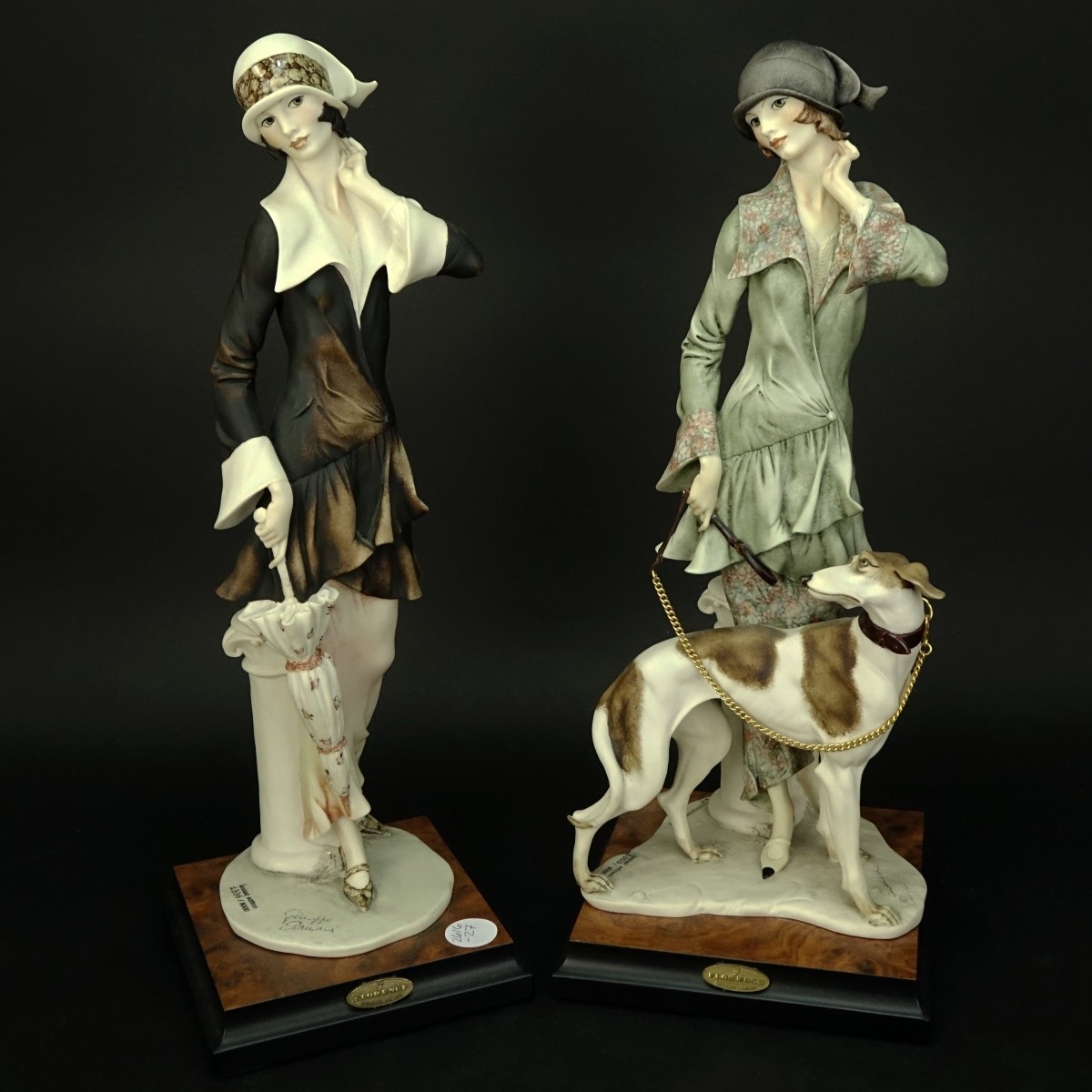 Two (2) Giuseppe Armani Limited Edition Polychrome Figurines. Includes: "Lady with Dog #2003/5000" and "Lady with Umbrella #1336/5000". Each signed throughout the surface, COA included. Largest measures 18" H, smallest measures 17-5/8" H. Domestic Shipping: Third party Min Est. $150.00 Max Est. $250.00