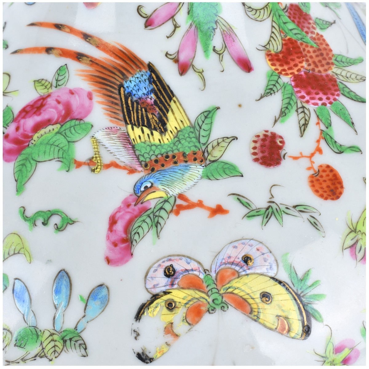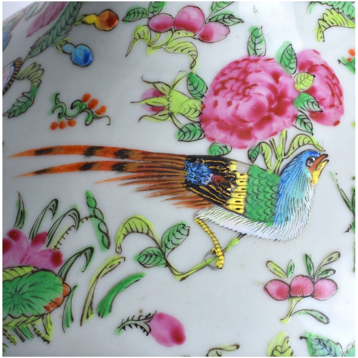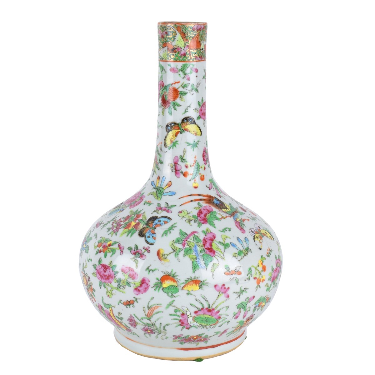 Chinese Export Porcelain Rose Medallion Vase. Bottle form depicting flowers and butterflies. Unsigned. Measures 13-7/8" H. Domestic Shipping: $88.00 Min Est. $200.00 Max Est. $400.00