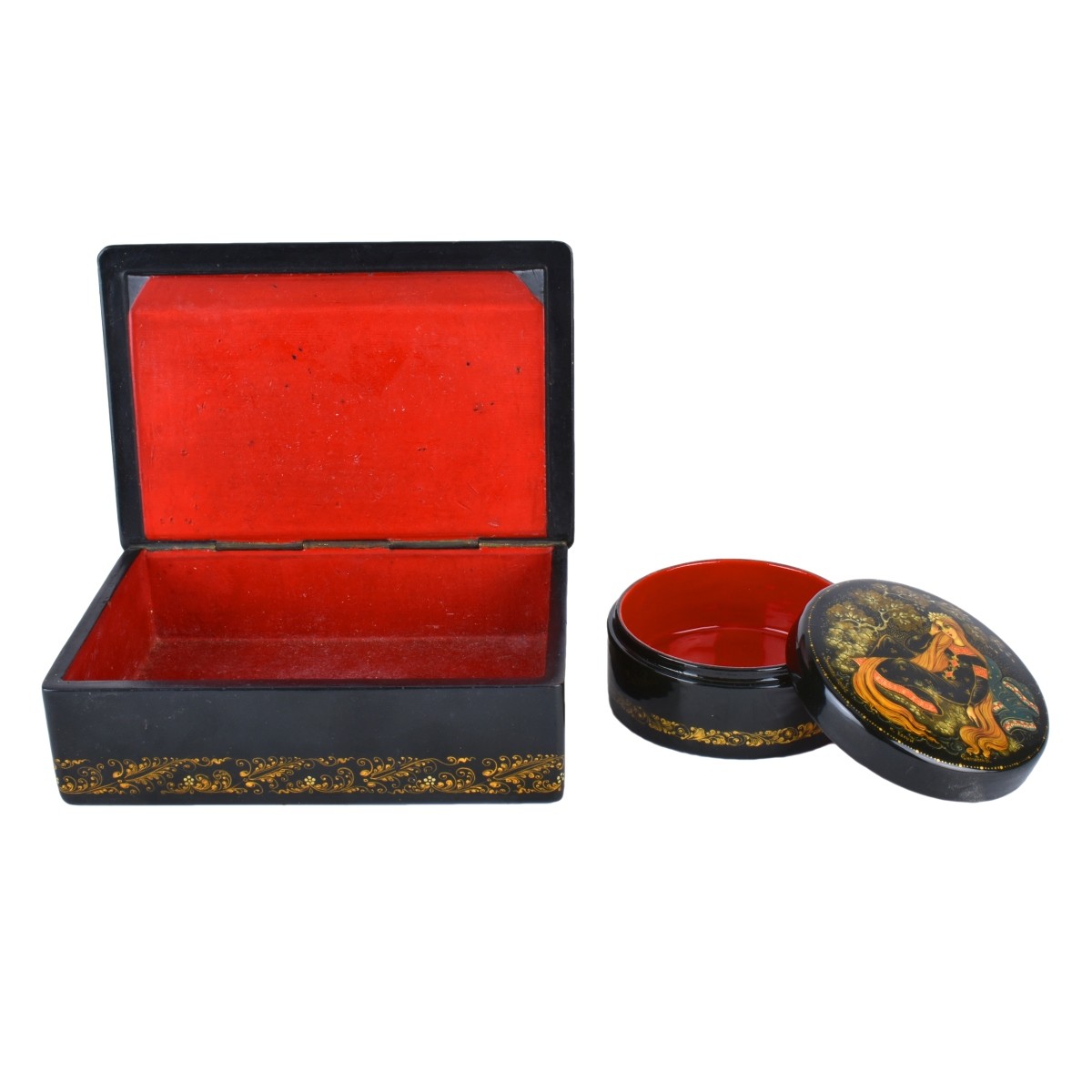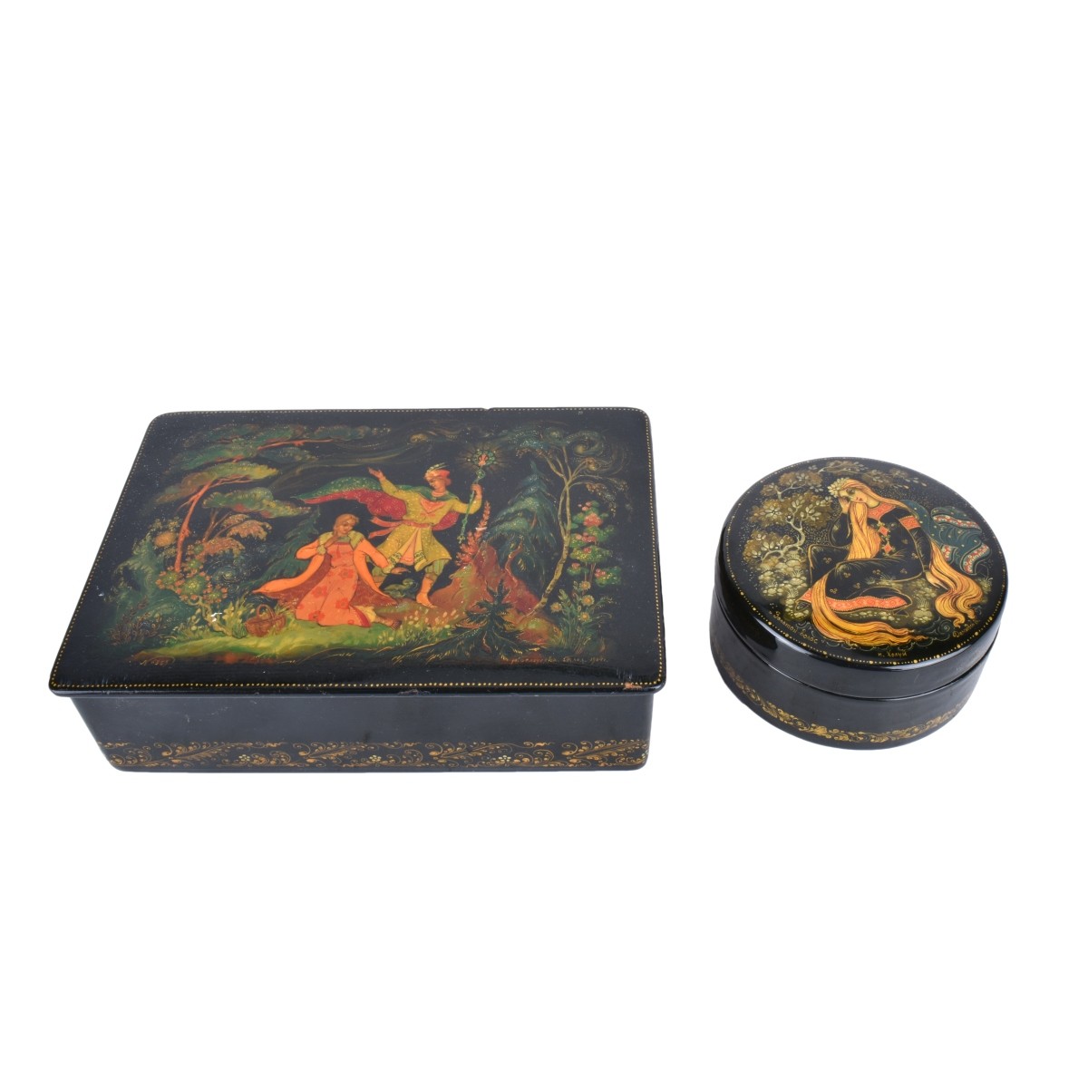 Two (2) Russian Black Lacquer Boxes. Signed. Each with figural scenes to top. Largest measures 1-1/2" H x 5-7/8" W, smallest measures 1-1/2" H x 3-1/8" W. Domestic Shipping: $36.00 Min Est. $50.00 Max Est. $100.00
