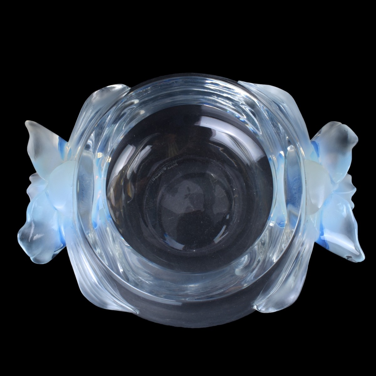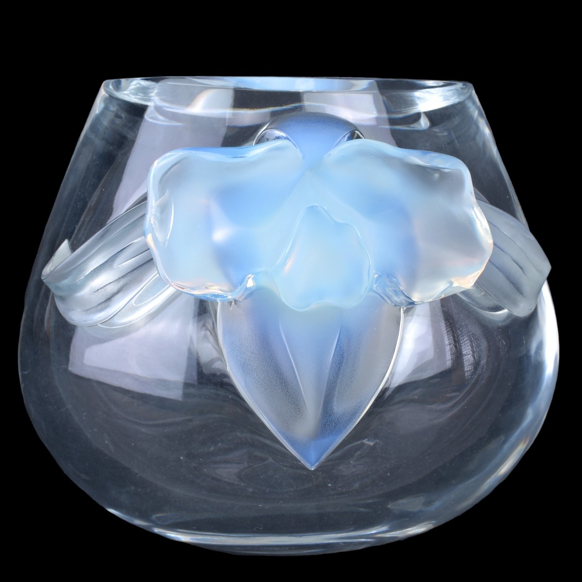 Lalique Crystal "Orchidee" Vase. Clear vase with two opalescent orchid flowers on the sides. Signed Lalique, France on bottom. Measures 6" H. Domestic Shipping: $95.00 Min Est. $600.00 Max Est. $800.00