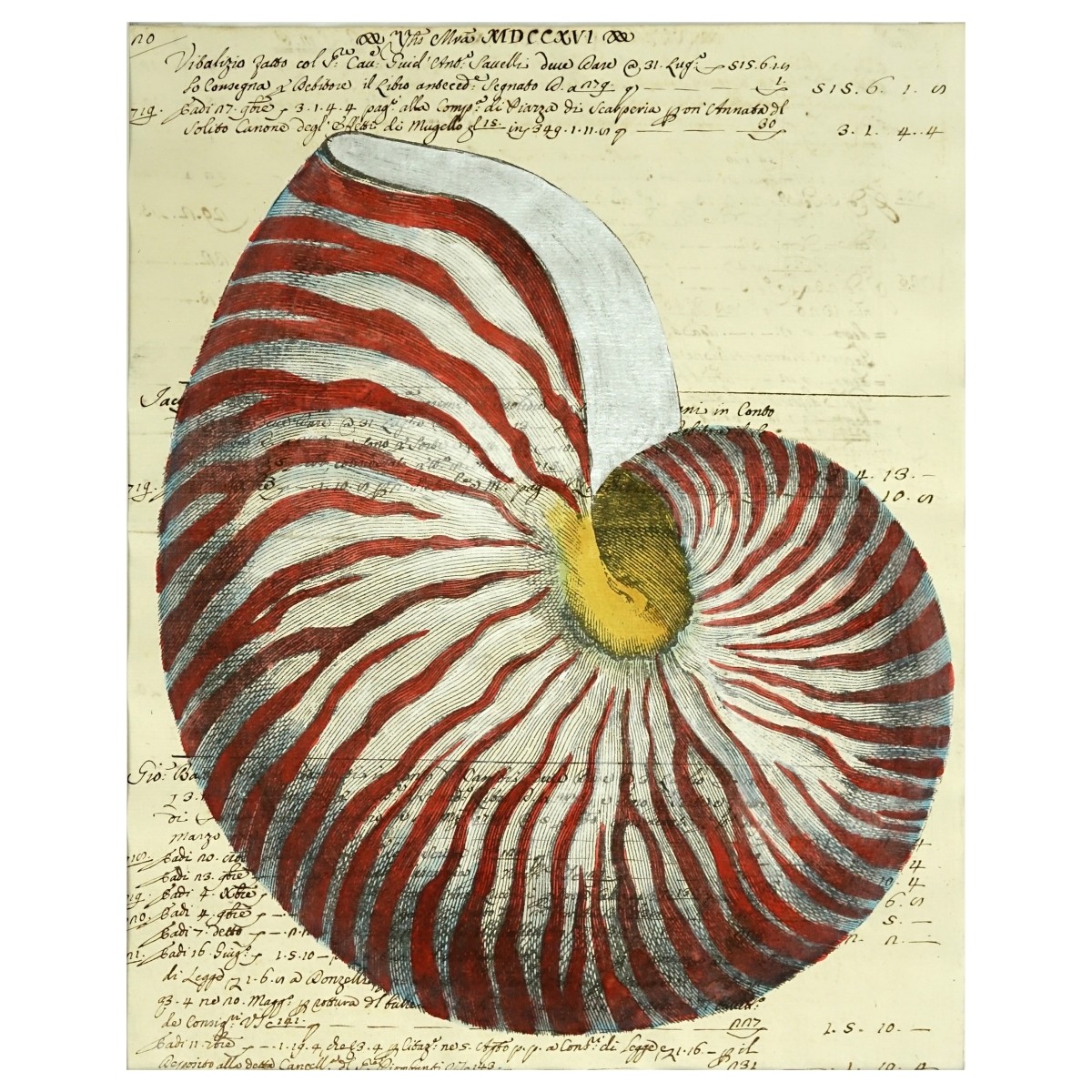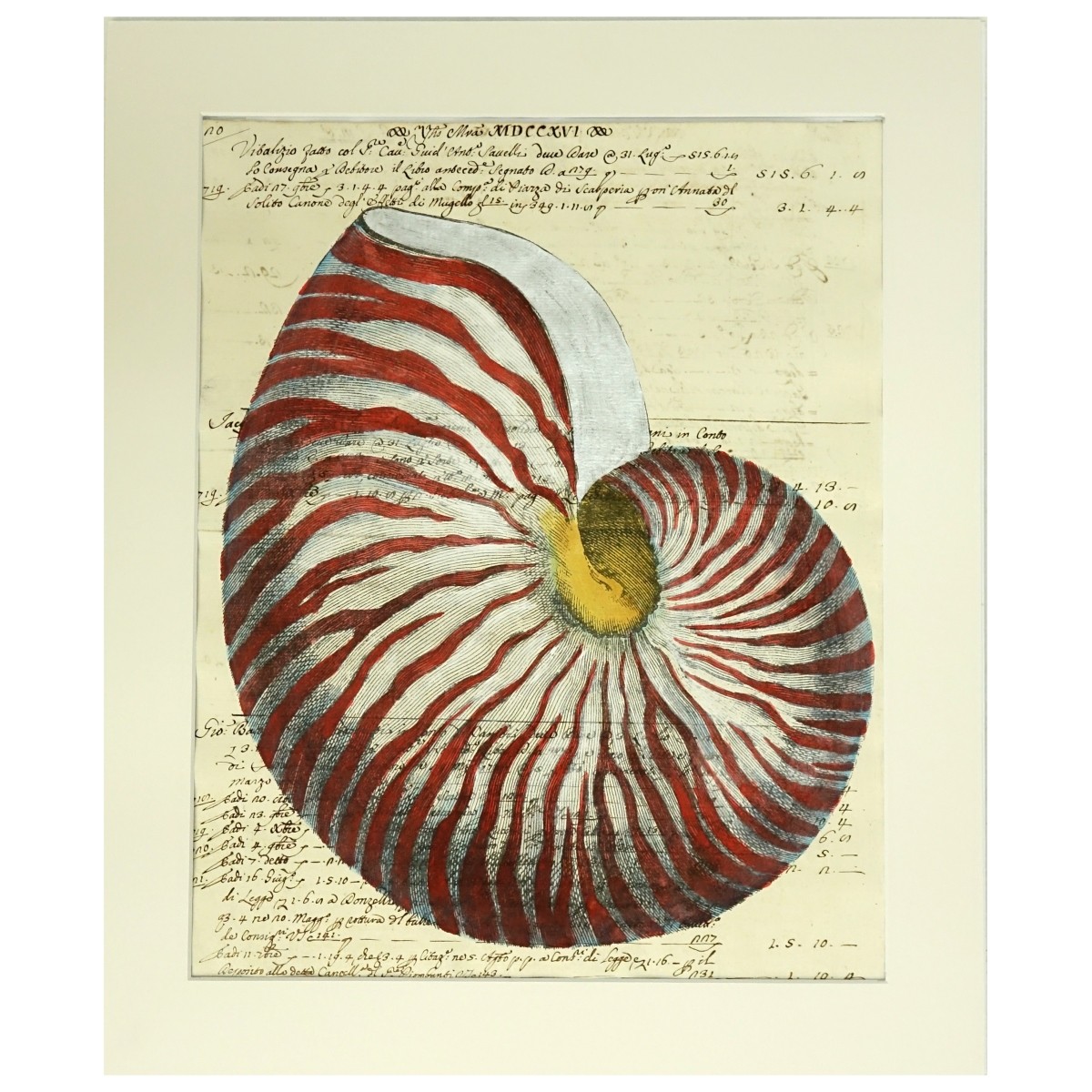 Hand Colored Engraving On 18th C Manuscript "Nautilus". Visible date of 1716 on manuscript. Measures 18-1/4" x 14-3/4", mat measures 21-1/2" x 18". Domestic Shipping: $125.00 Min Est. $300.00 Max Est. $400.00