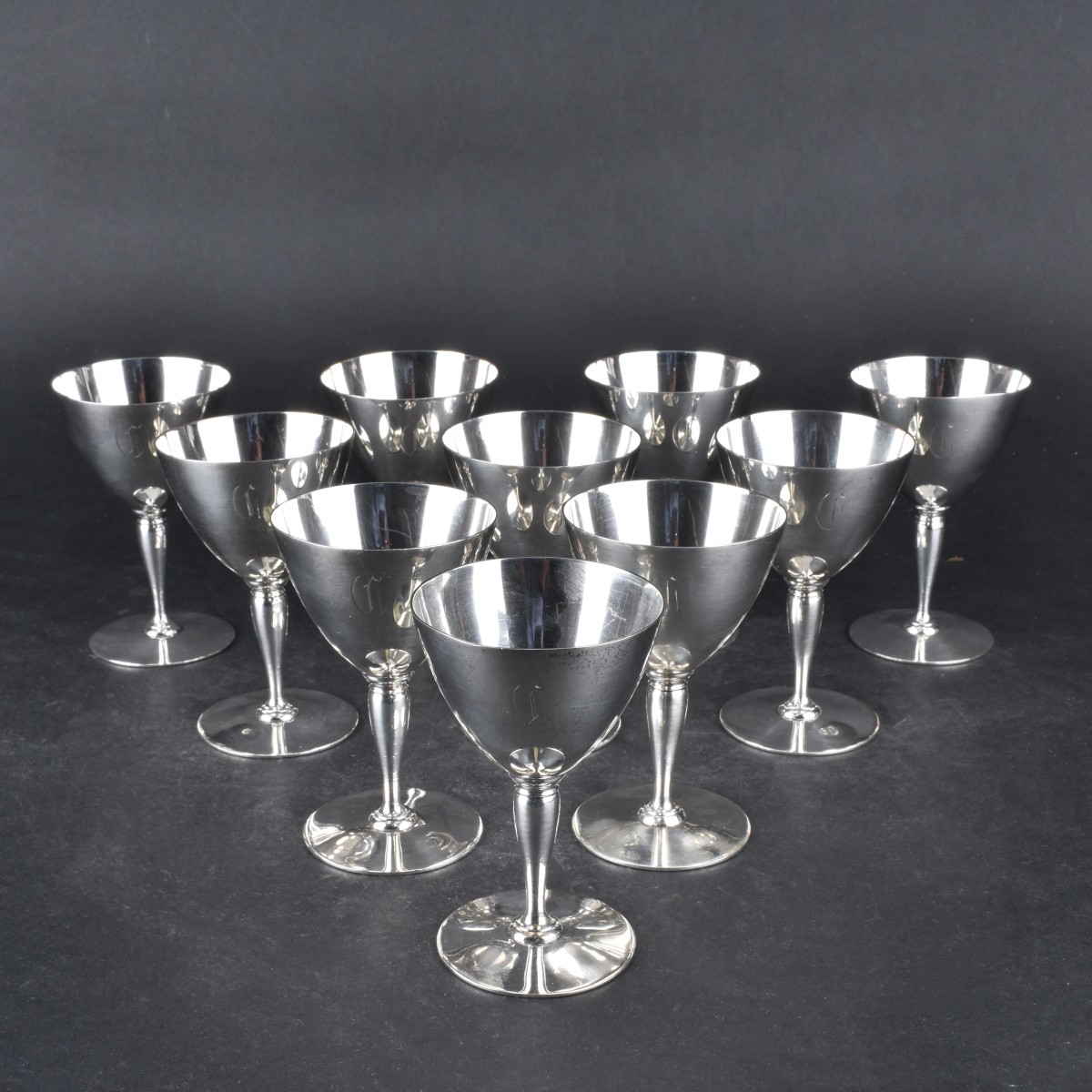 Set of Ten (10) Tiffany & Co Sterling Silver Cups. Signed Tiffany & Co makers 18885/16951 to base, monogram on surface. Measures 4" H. Approx. weight: 36 troy ounces. Domestic Shipping: $78.00 Min Est. $1000.00 Max Est. $1500.00