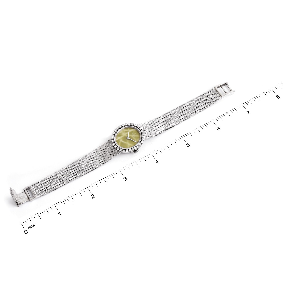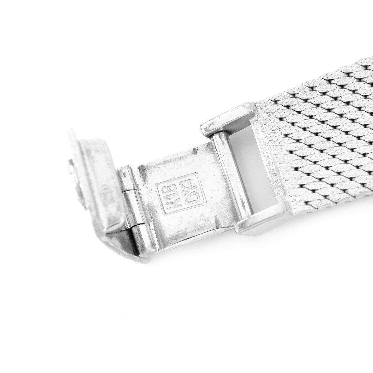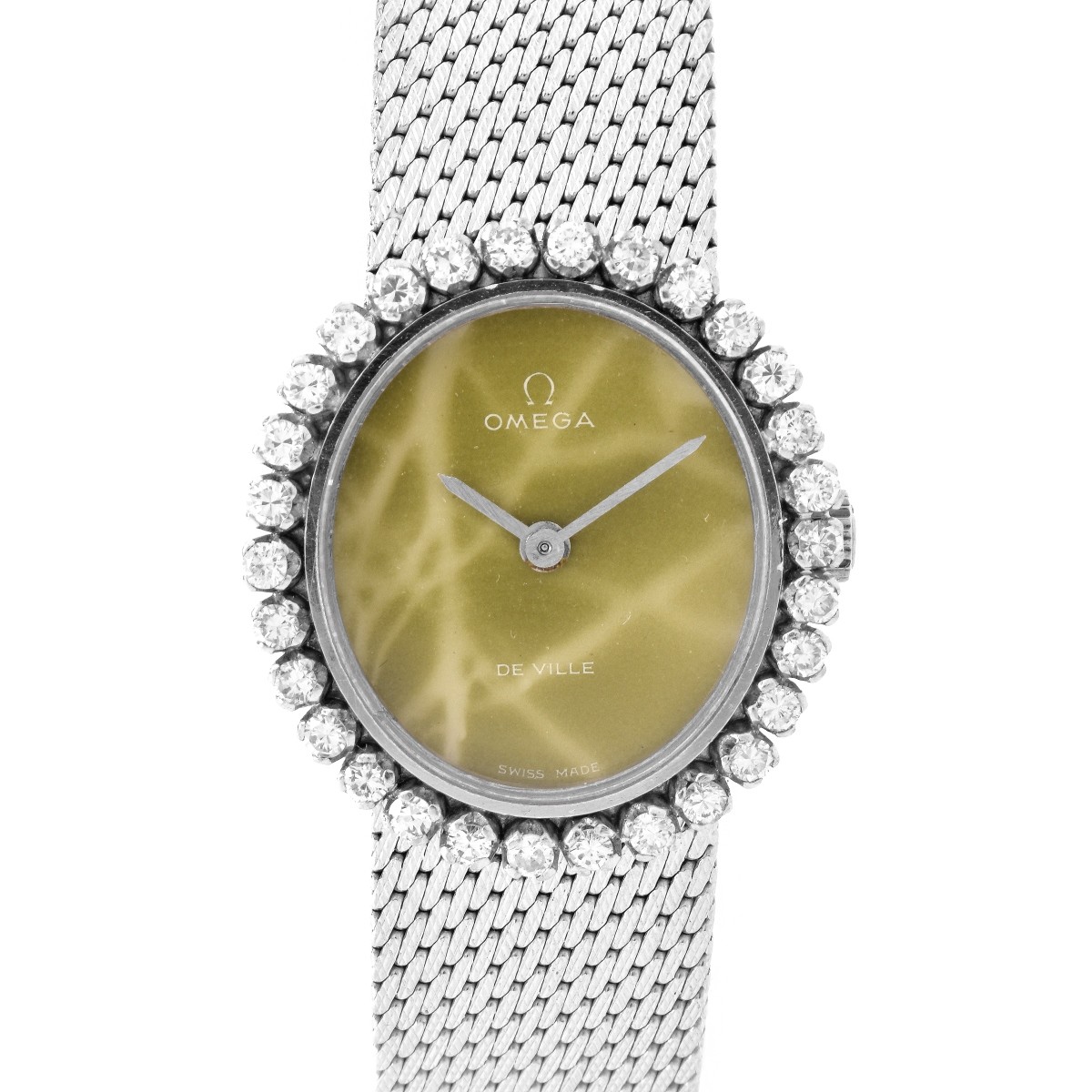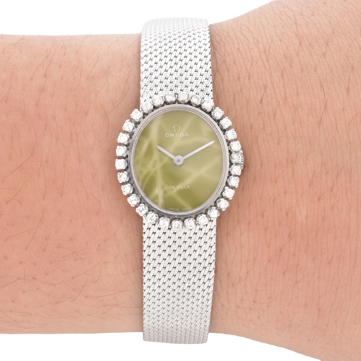 Lady's Vintage Omega De Ville 18 Karat White Gold Bracelet Watch with Diamond Bezel, Manual Movement. Case measures 24mm x 21.5mm. Bracelet measures 7" L. Approx. weight: 45.0 grams. Condition: Very good condition. Running. Please note the gallery does not warranty the running condition of watches. Estimate: $2500.00 - $3500.00 Domestic Shipping: $32.00