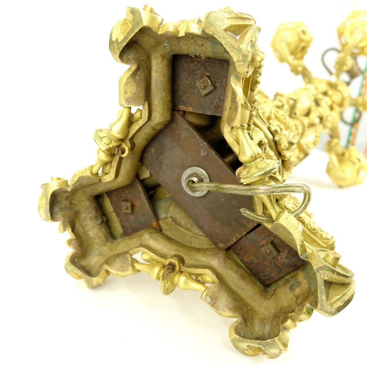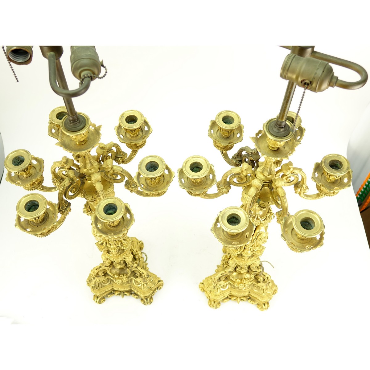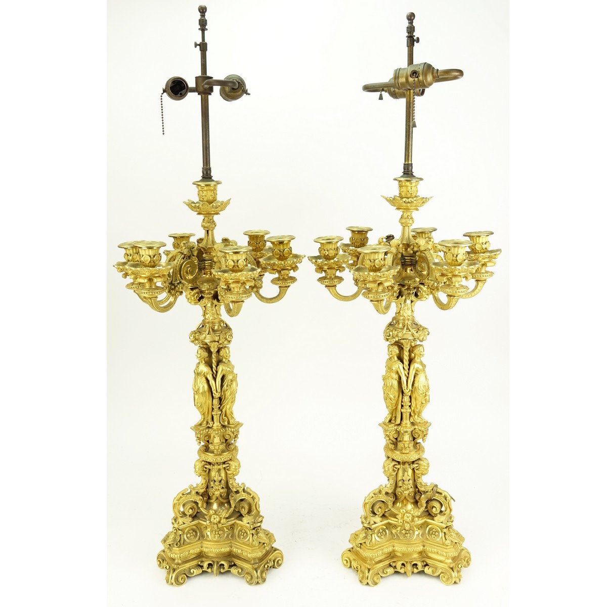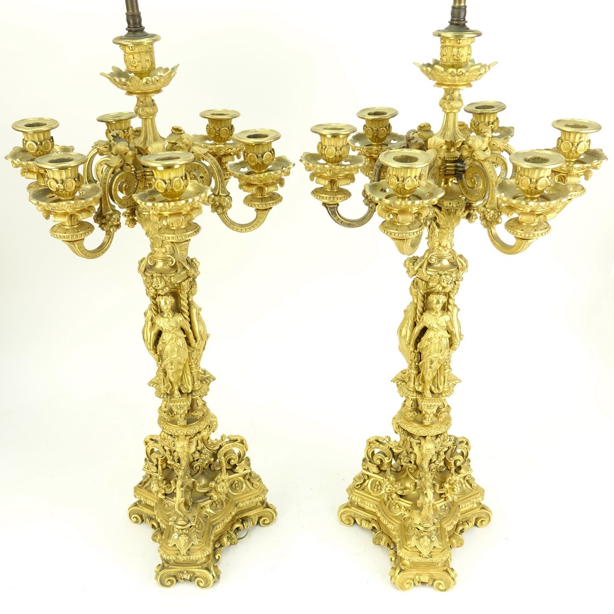 Pair of Impressive French Napoleon III Style Gilt Bronze Figural Six Light Candelabra. Three figures encircling the stem with intricate flowers and leaves decor. Measures 37-3/4" H x 12-3/4" W. Condition: Rubbing, needs to be rewired otherwise good condition Estimate: $3000.00 - $5000.00 Domestic Shipping: Third party