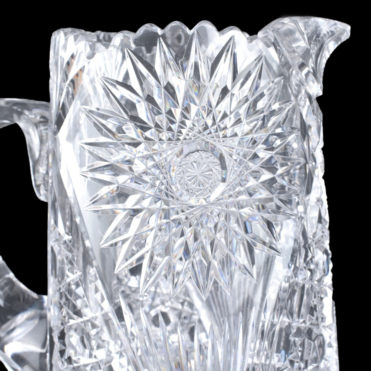 Collection of Four (4) Cut Glass Tableware. Includes: bowl, pitcher, and 2 vases. Tallest vase measures 11-7/8" H, bowl measures 4" H X 6-1/4" W. Condition: One vase has a chip to rim otherwise good condition. Estimate: $100.00 - $150.00 Domestic Shipping: Third party