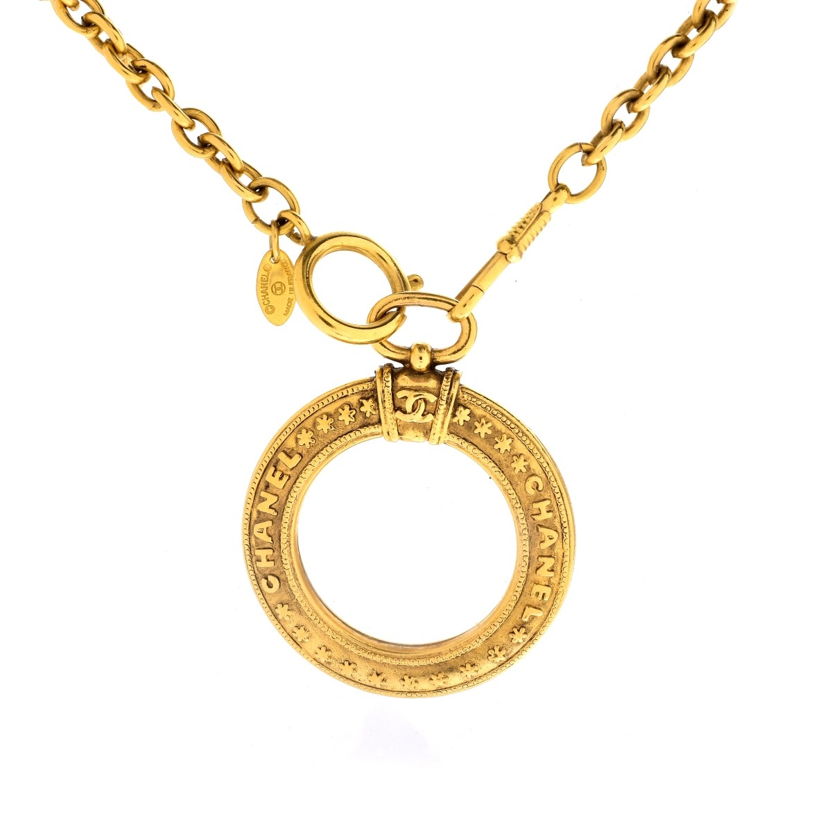 Chanel Gold Tone Magnifying Glass Necklace. Labeled appropriately. Measures 16-1/2" L. Condition: Pre-owned "as new" condition. Estimate: $500.00 - $600.00 Domestic Shipping: $30.00
