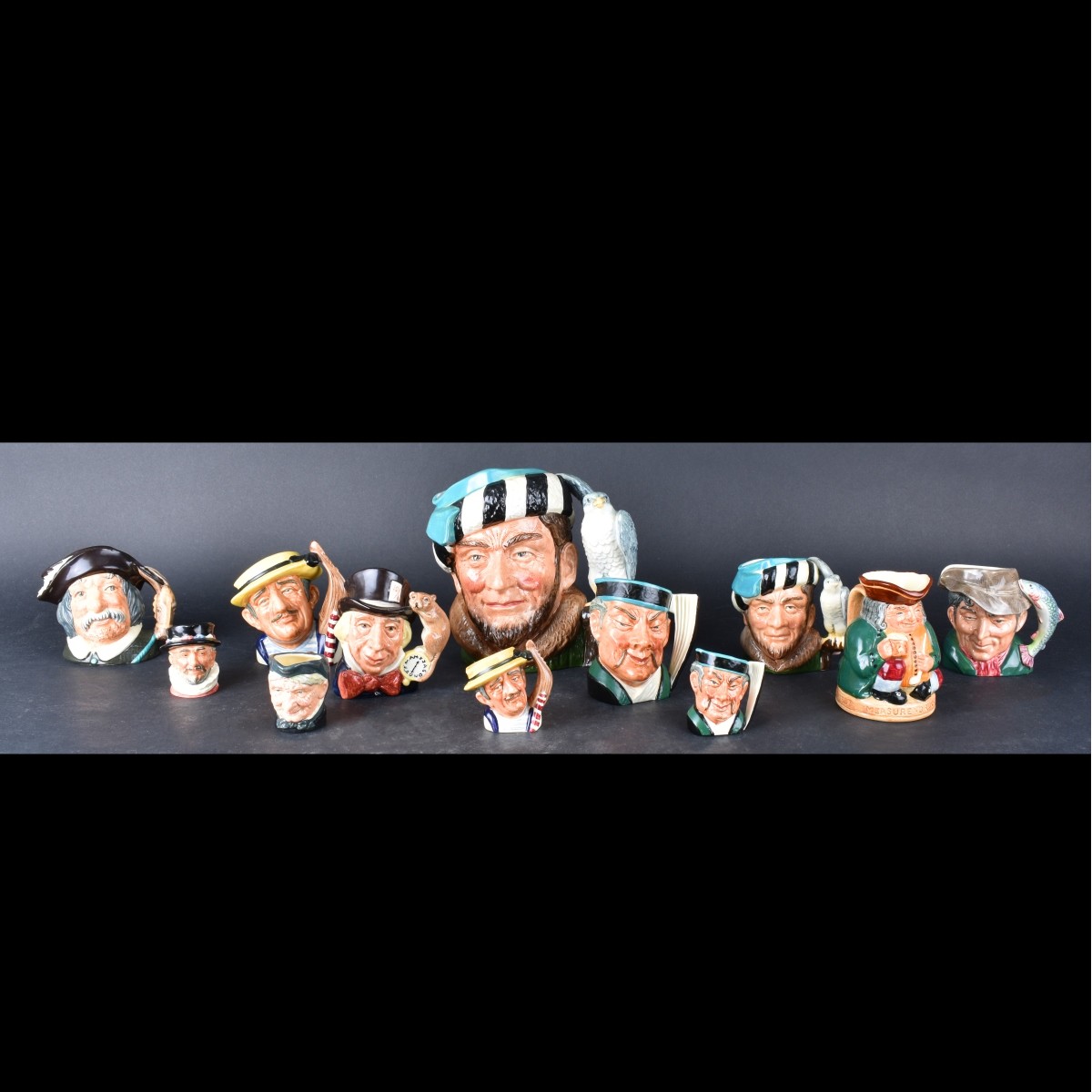 Collection of Twelve (12) Vintage Royal Doulton Porcelain Toby Mugs. Each appropriately signed and titled to base. Tallest measures 7" H, smallest measures 2-1/2" H. Condition: Good condition Estimate: $100.00 - $150.00 Domestic Shipping: Third party