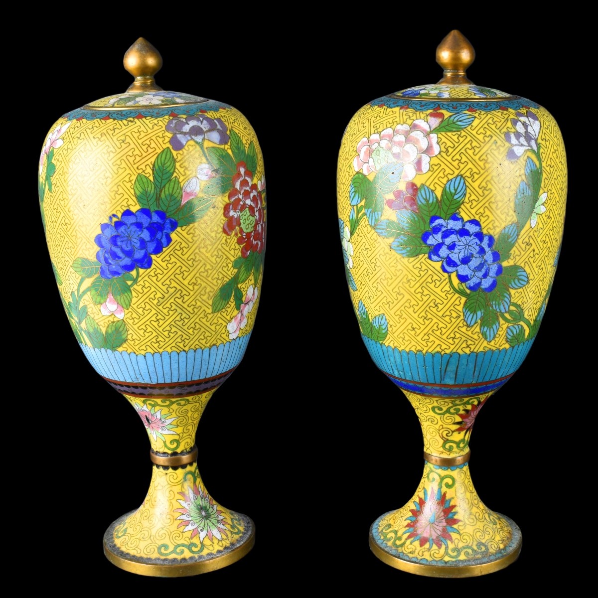 Pair of Chinese Cloisonne Enamel Pedestal Covered Vases. Flower decor on yellow ground. Measures 12-3/4" H. Condition: Rubbing and light wear to enameling at the base otherwise good condition Estimate: $200.00 - $400.00 Domestic Shipping: $115.00