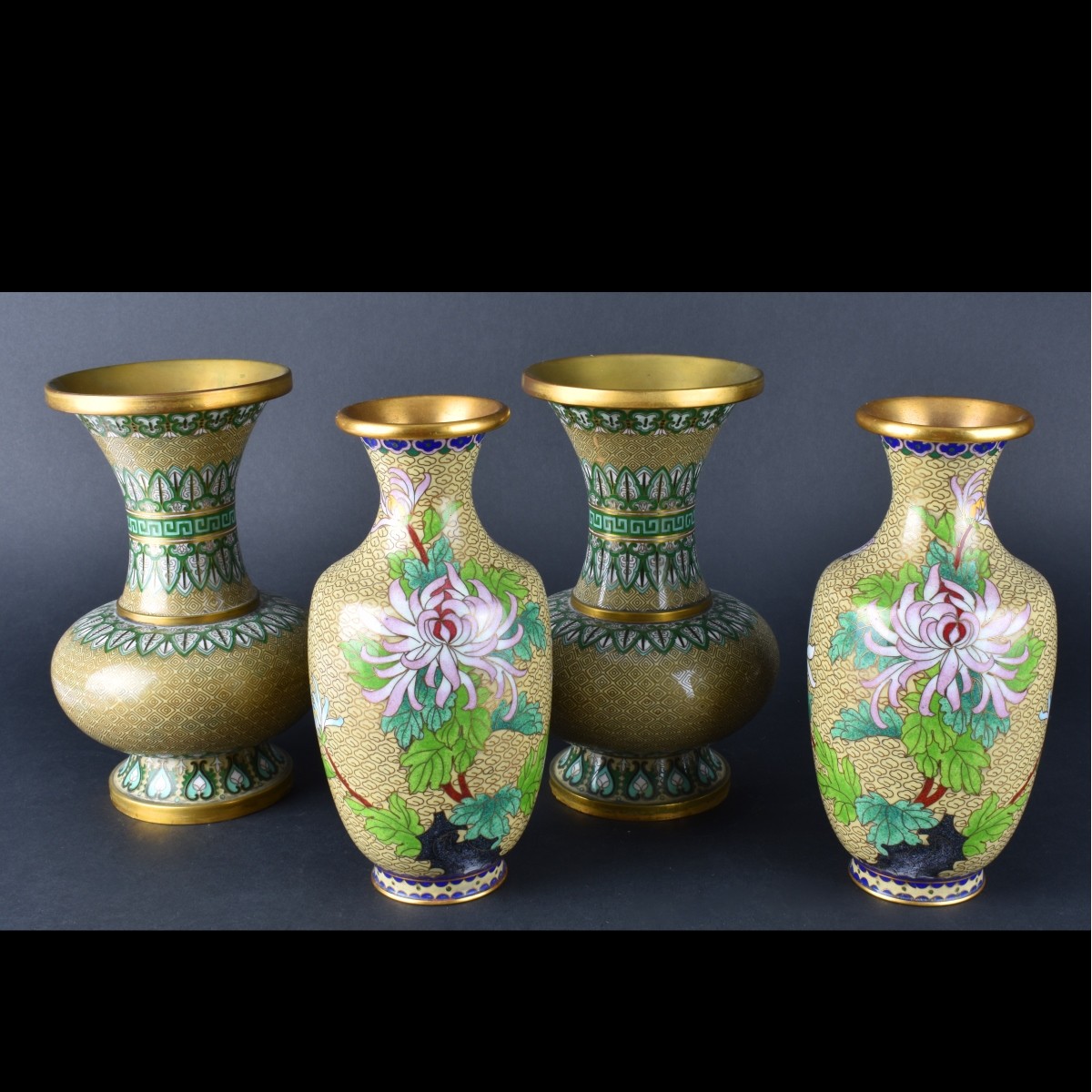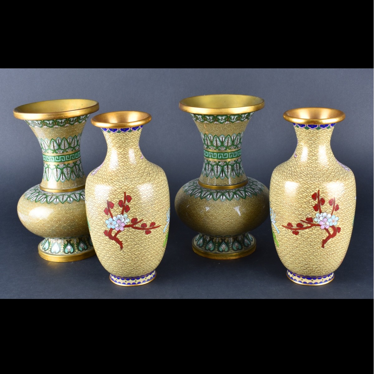 Grouping of Four (4) Chinese Cloisonne Enamel Vases. Lot consists of two pairs. Tallest measures 8-1/8" H, other measures measures 8" H. Condition: Good condition Estimate: $300.00 - $400.00 Domestic Shipping: $88.00