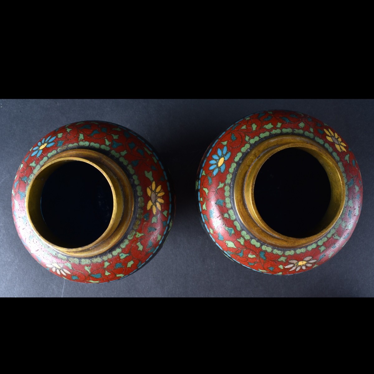 Pair of Chinese Cloisonne Enamel Miniature Covered Vases. Flowers and elaborate patterns on surface with distinguished home motif to the top. Measures 4-5/8" H. Condition: small layer wear to the lids otherwise good condition Estimate: $200.00 - $300.00 Domestic Shipping: $38.00
