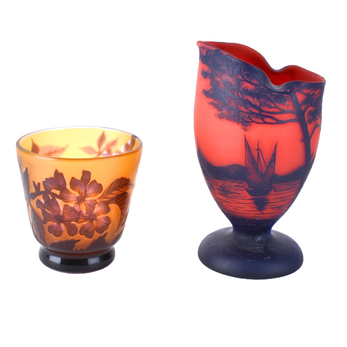 Two (2) Art Nouveau Cameo Glass Tableware. Includes: Galle cup and a vase signed Richard. Each is marked on surface. Vase measures 6-1/8" H, cup measures 3-1/2" H. Condition: Good condition Estimate: $300.00 - $500.00 Domestic Shipping: $48.00