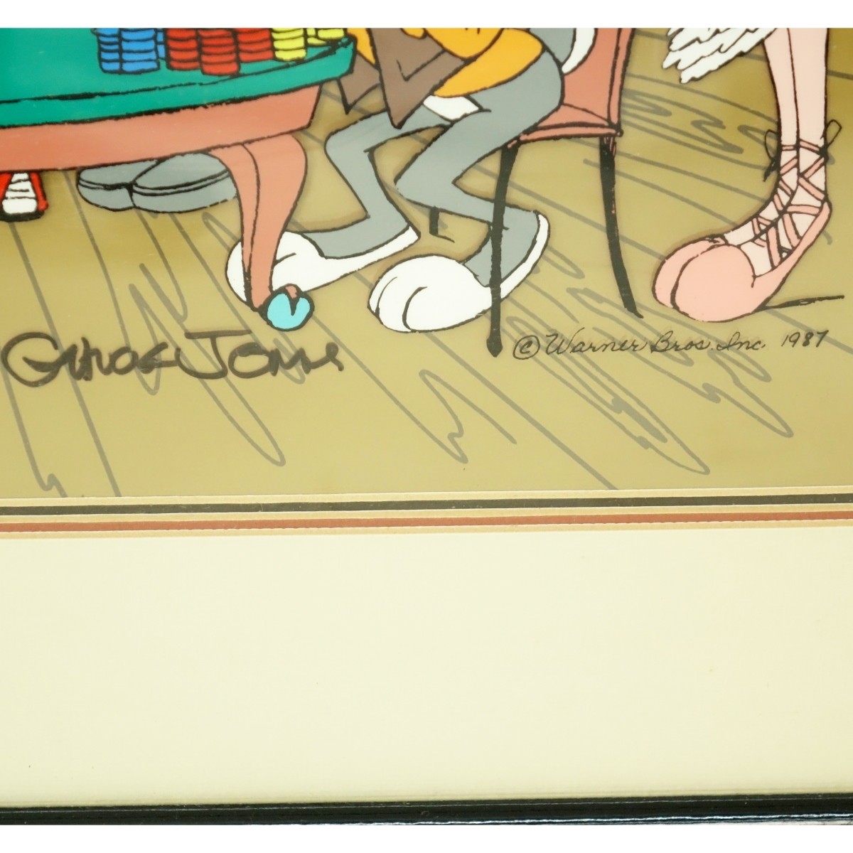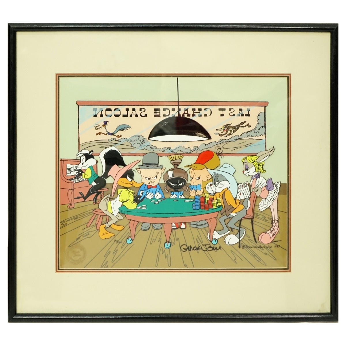 Chuck Jones, American (1912-2002) Limited Edition Cell "Last Chance Saloon". Signed in marker. Authenticity stamp from Linda Jones, Copyright Warner Brothers Inc. 1987. Measures 12-5/8" x 15-5/8" (sight), frame measures 20" x 23". Condition: Good condition. Estimate: $200.00 - $250.00 Domestic Shipping: $115.00
