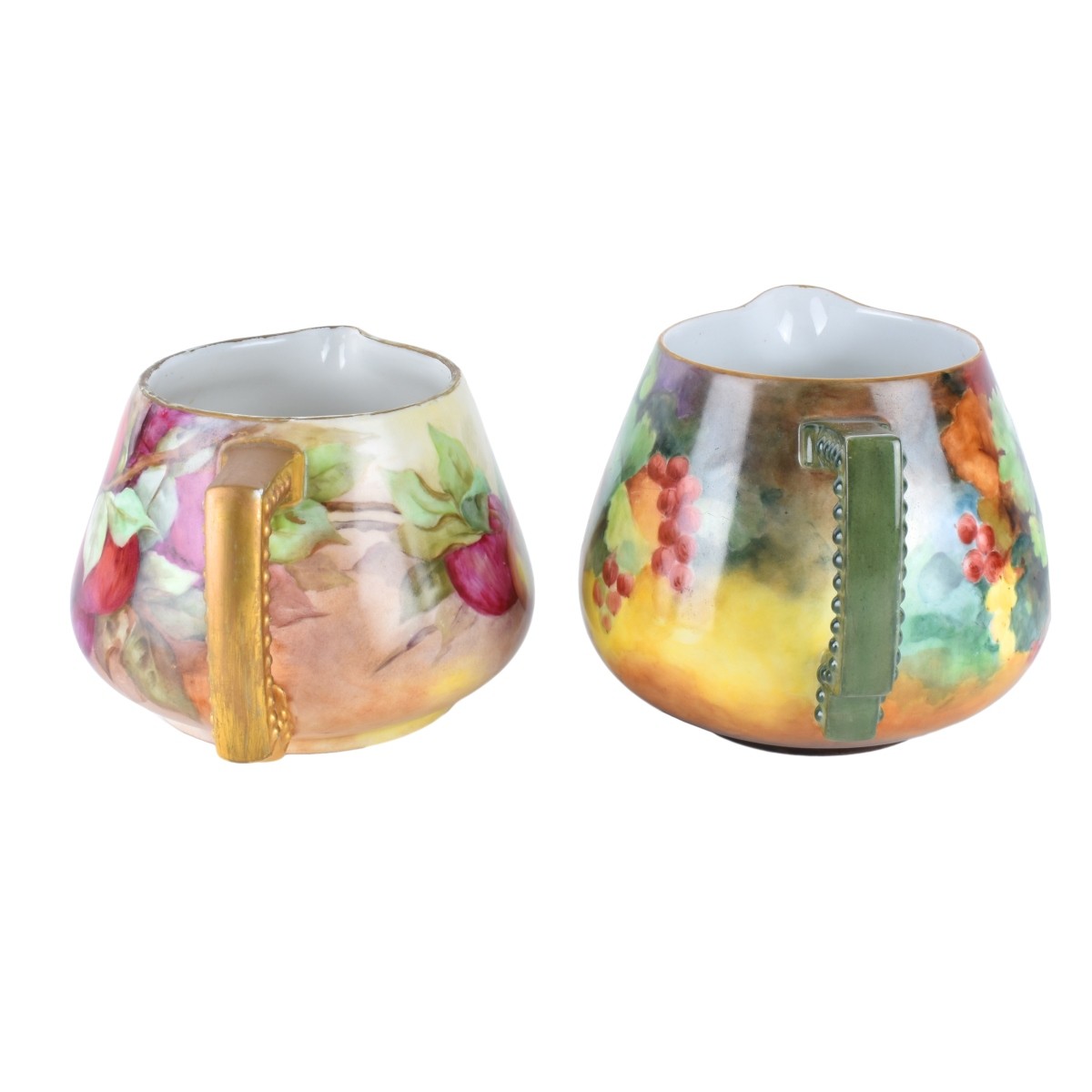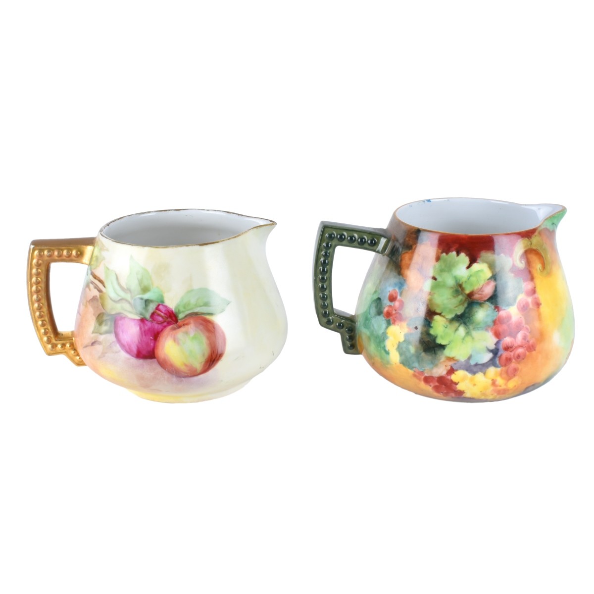 Two (2) Antique Porcelain Lemonade Pitchers. Makers: Limoges and Bavaria inscribed A.E. Pierce 1904, Limoges pitcher has a faint inscription to base. Largest measures 6-3/8" H x 8-3/4" W, other measures 5-1/2" H x 8-3/4" W. Condition: Rubbing to gilt otherwise good condition Estimate: $100.00 - $150.00 Domestic Shipping: Third party
