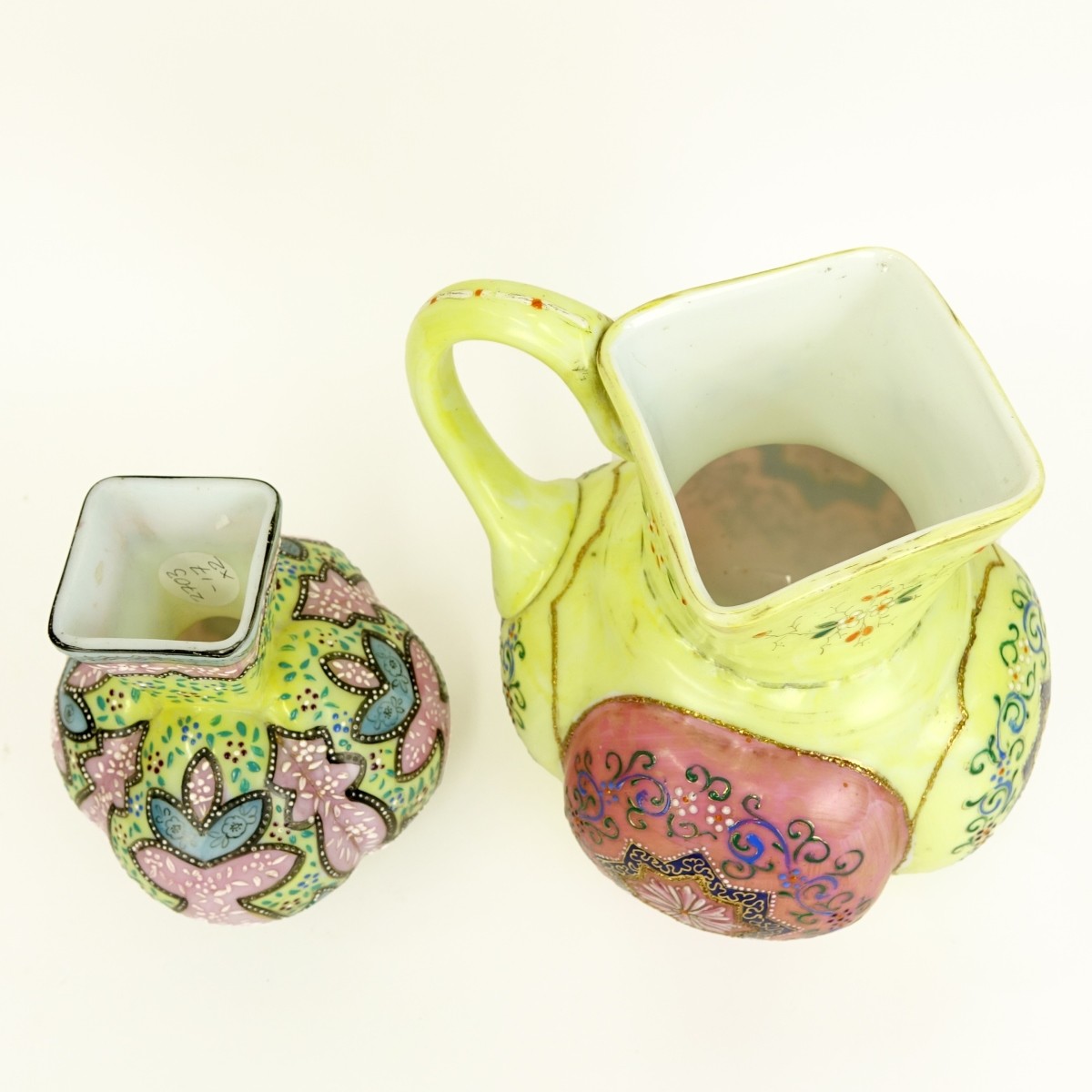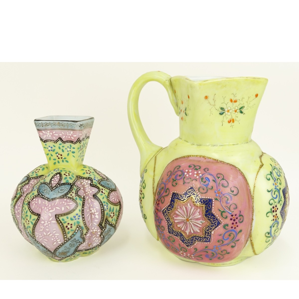 Two (2) Piece Lot of Thomas Webb Morrocan Glass Pitcher and Vase. Open pontil to base. Pitcher measures 8-7/8" H, vase measures 7" H. Condition: Rubbing to paint otherwise good condition Estimate: $100.00 - $150.00 Domestic Shipping: Third party
