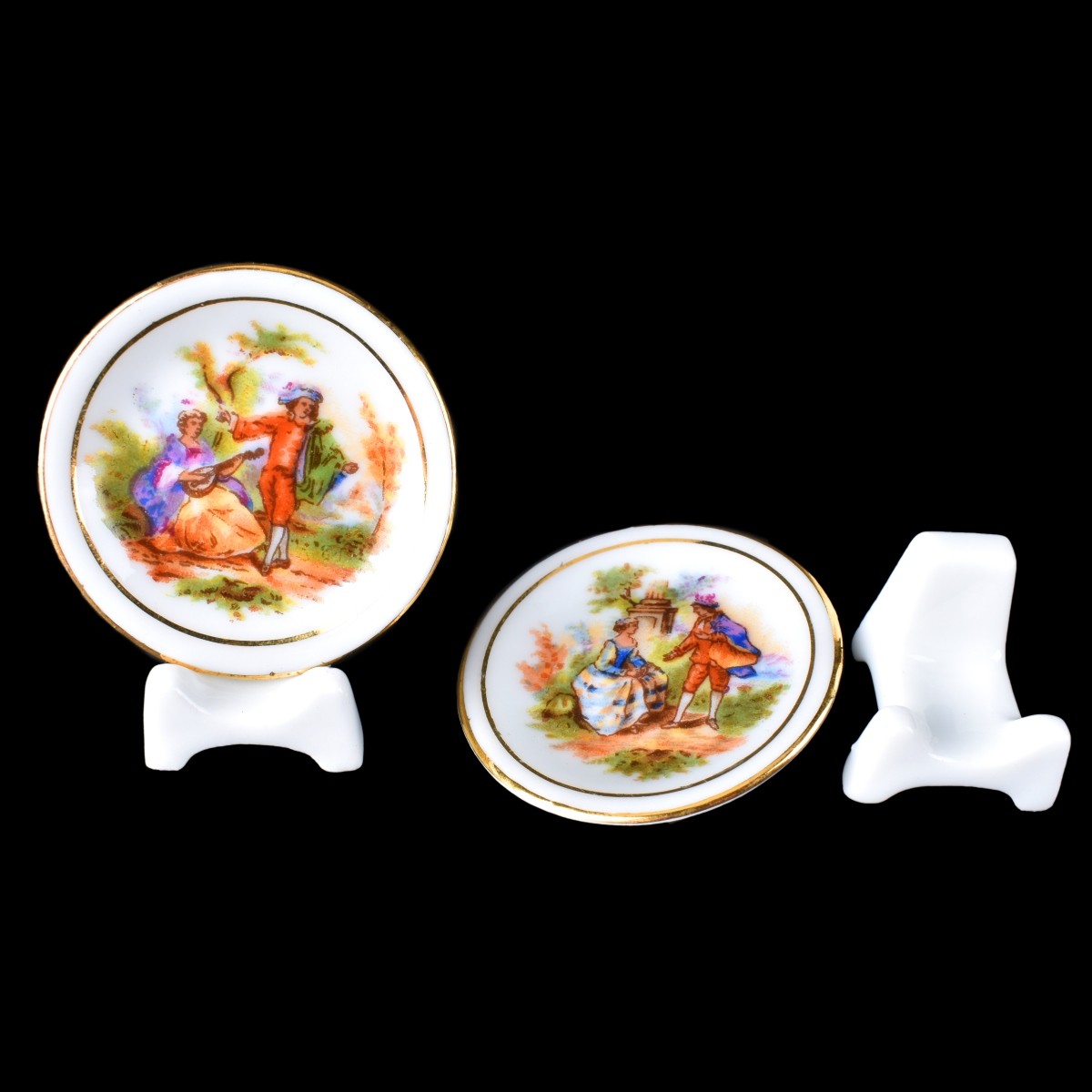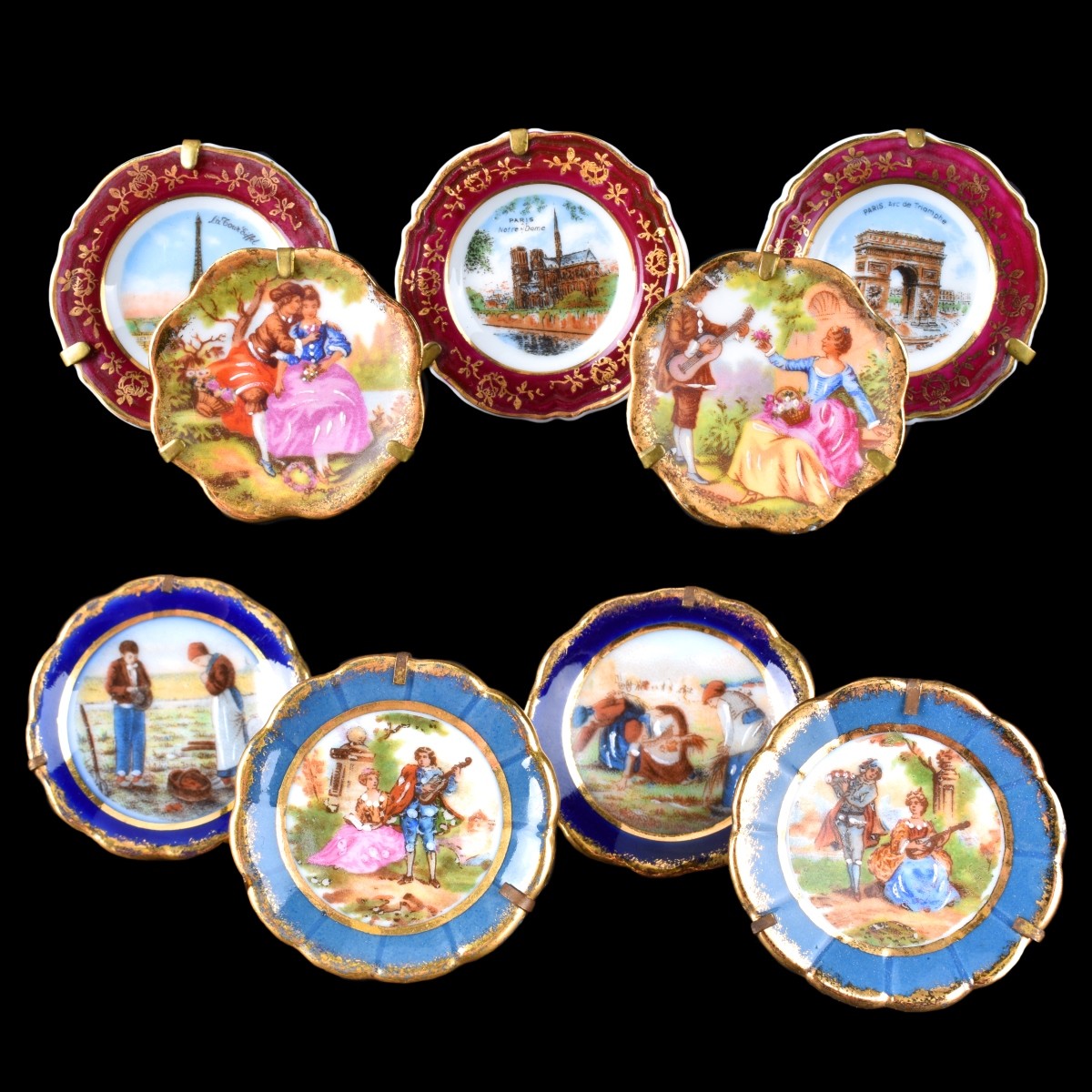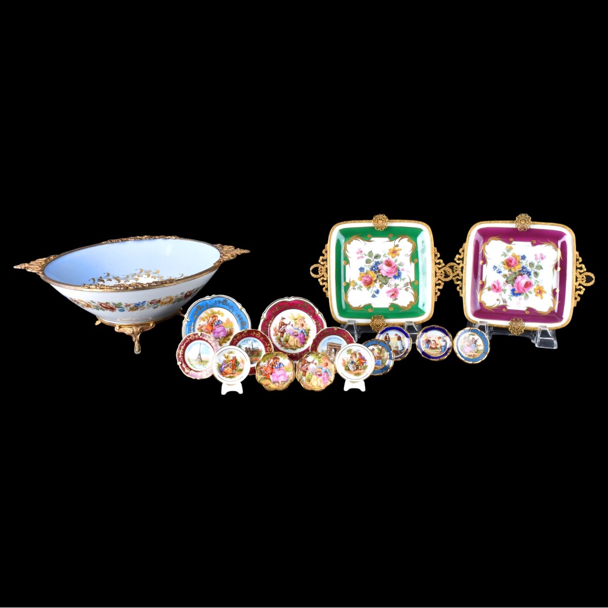 Grouping of Thirteen (13) Limoges Porcelain Tableware. Includes: Footed bowl 3-7/8" x 11-1/2", 2 ashtrays 7", 13 miniature plates. Each appropriately signed. Condition: Good condition Estimate: $100.00 - $200.00 Domestic Shipping: $72.00