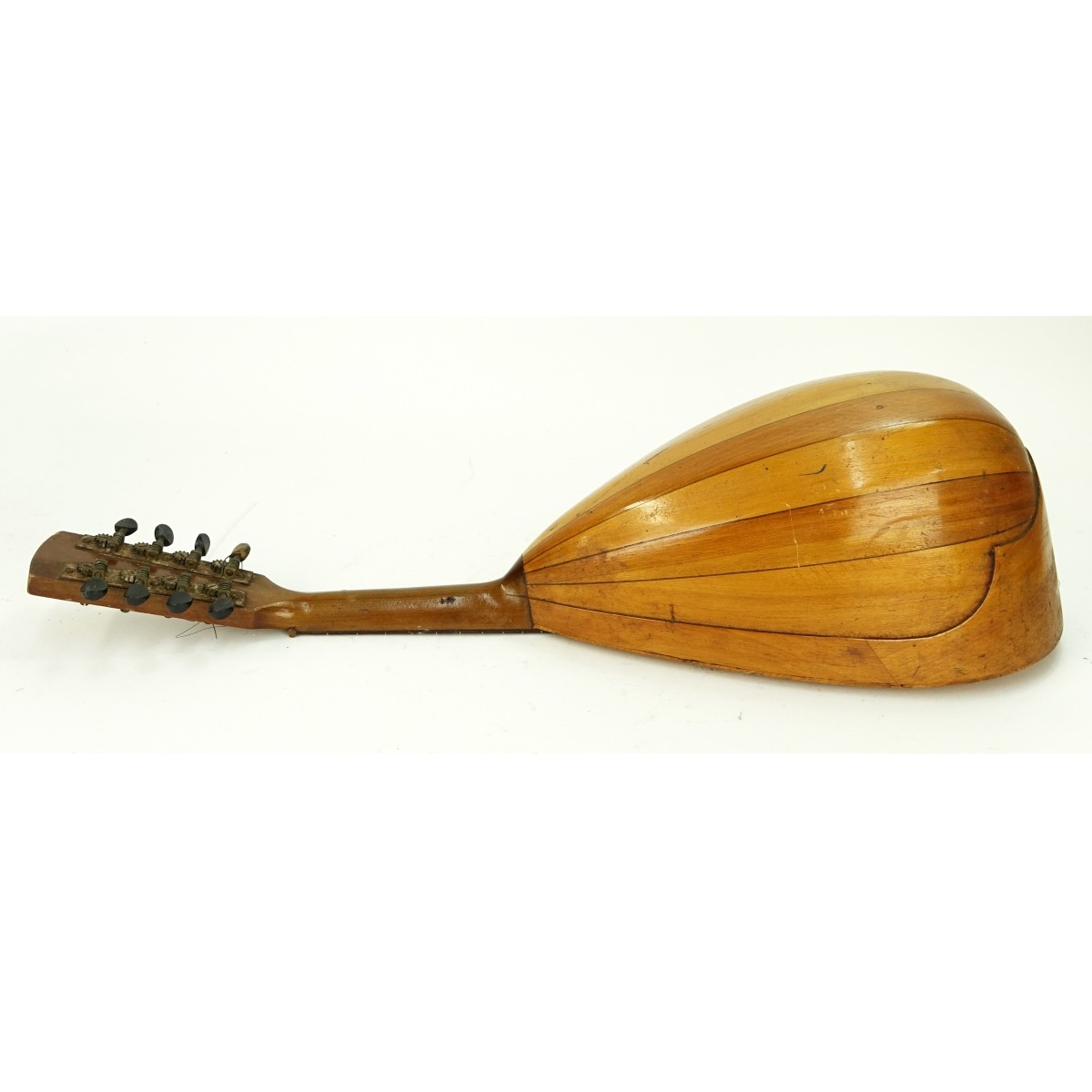 Antique Oscar Schmidt Style Tater Bug 8 String Mandolin. Decorated with inlaid top portion. Measures 24-1/2" L. Condition: Wear to wood, missing strings otherwise good condition Estimate: $50.00 - $100.00 Domestic Shipping: Third party