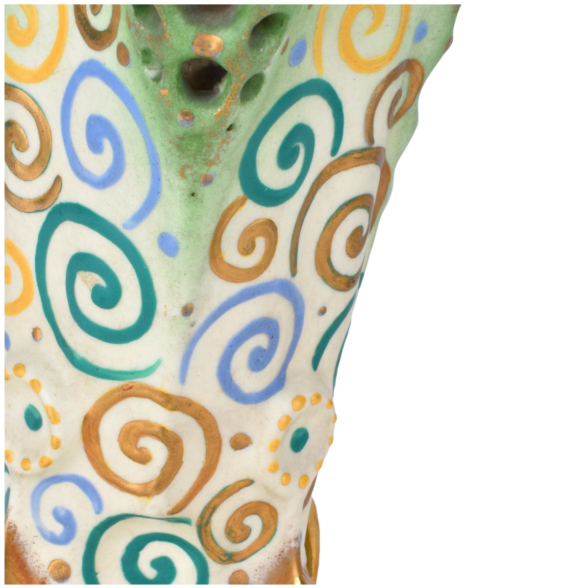 Werke Reissner Amphora "Espaniola" Pierced and Handled Vase. Impressed mark to base and numbered 11838/47. Measures 16-3/8" H x 6" W. Condition: Good condition, minor rubbing to gilt. Estimate: $200.00 - $400.00 Domestic Shipping: Third party