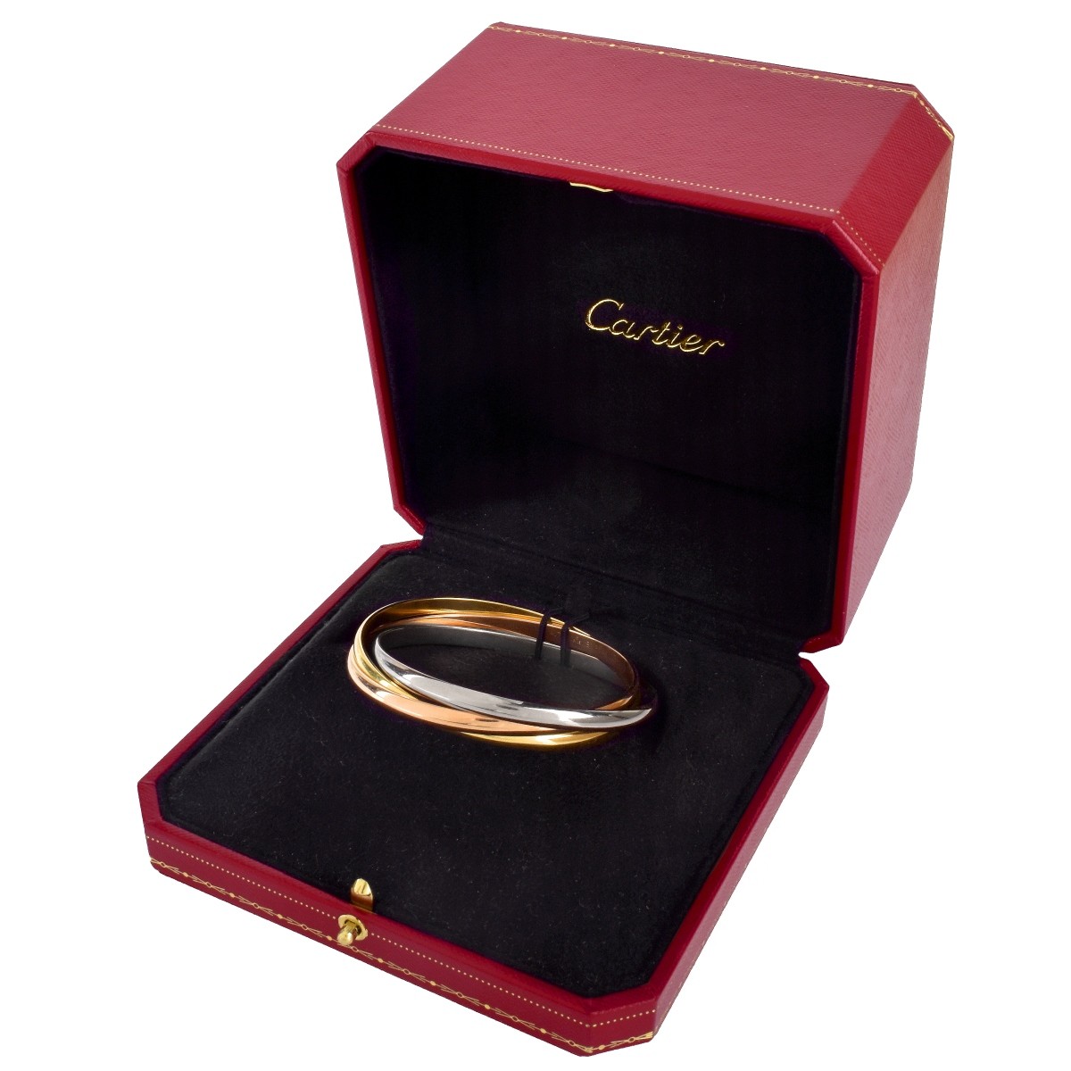 Vintage Cartier 18 Karat Tri-Color Gold Trinity Bangle Bracelet with Box. Signed, stamped 750, numbered BMG 144. Measures 3/16" W, 2-1/4" interior diameter. Approx. weight: 58.2 grams. Condition: Very good vintage condition. Minor wear. Estimate: $4500.00 - $6500.00 Domestic Shipping: $32.00
