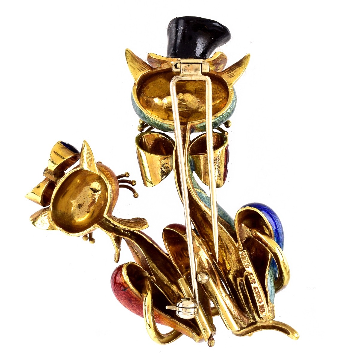 Vintage Italian Heavy 18 Karat Yellow Gold and Enamel Cat Couple Brooch. Stamped Italy 18K. Measures 2-1/4" H, 1-7/8" W. Approx. weight: 40.9 grams. Condition: Small enamel losses. Overall good vintage condition. Estimate: $1000.00 - $1400.00 Domestic Shipping: $30.00