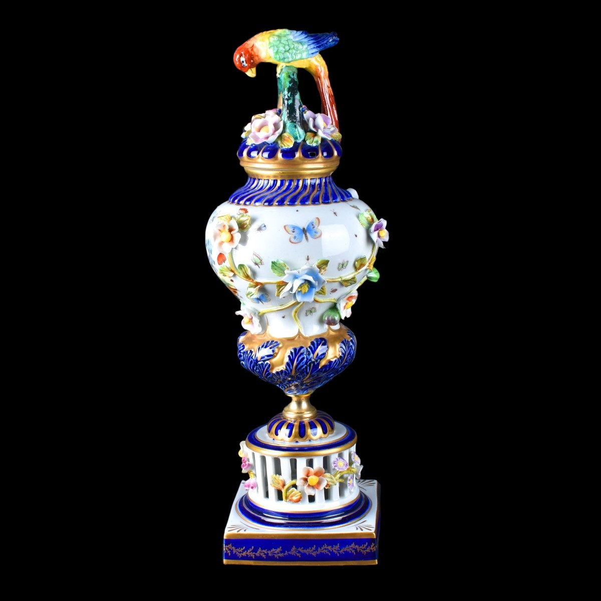 Modern Sevres Porcelain Urn. Colorful parrot finial and decorated with fruit and flowers as well as a figural vignette. Signed. Measures 17" H. Condition: Typical minor losses to petals. Estimate: $100.00 - $150.00 Domestic Shipping: Third party