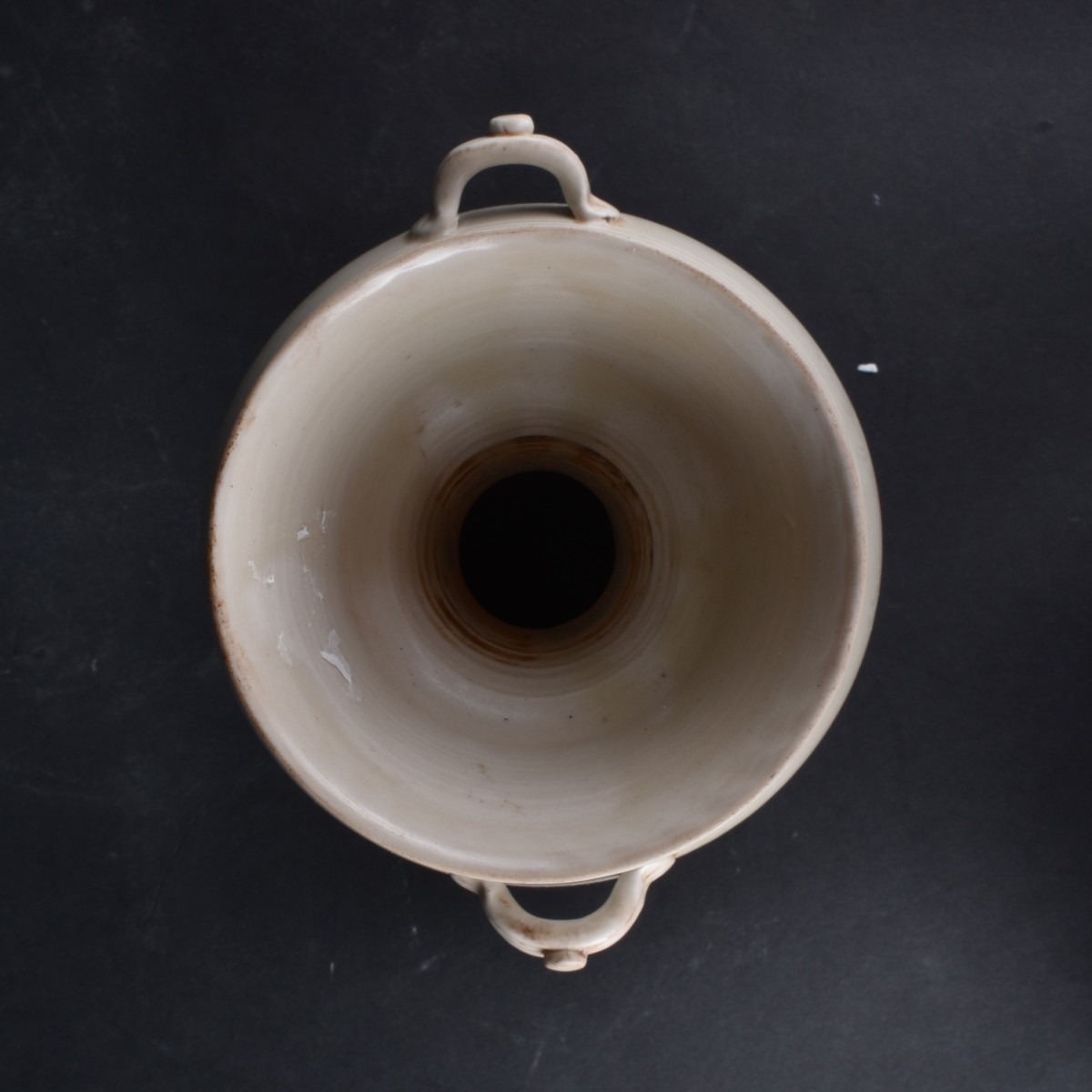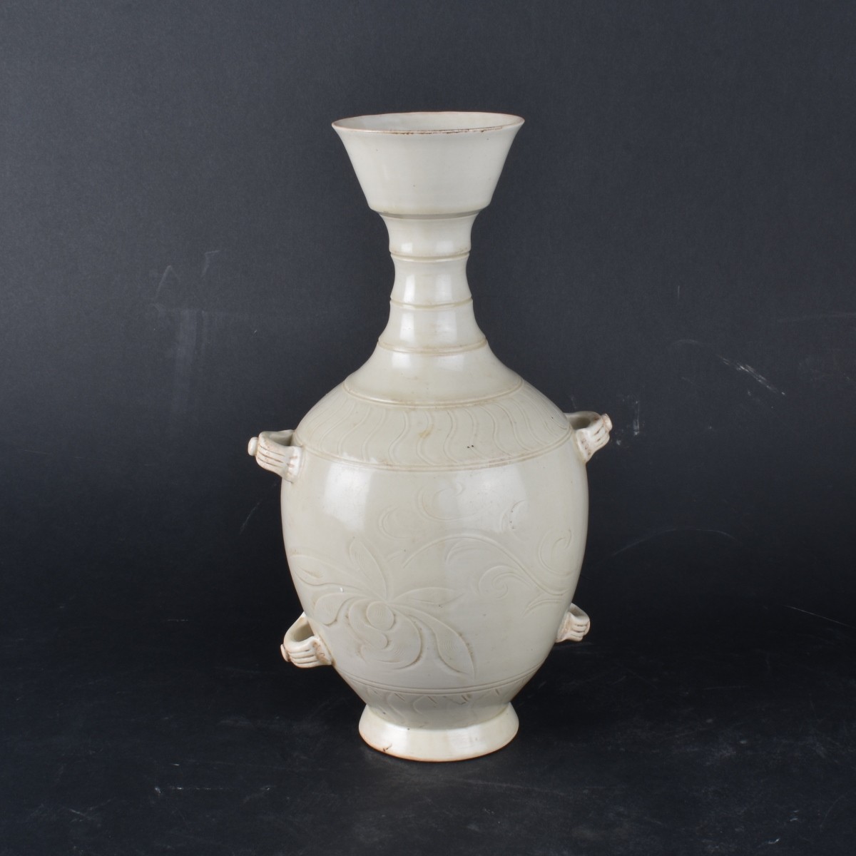 Chinese Song Dynasty Style Ding Ware Pottery Vase with Mock Handles. Signed. Asian Antiques gallery label attached to surface. Measures 11-1/2" H x 6-1/2" W. Condition: Good condition Estimate: $150.00 - $250.00 Domestic Shipping: $78.00