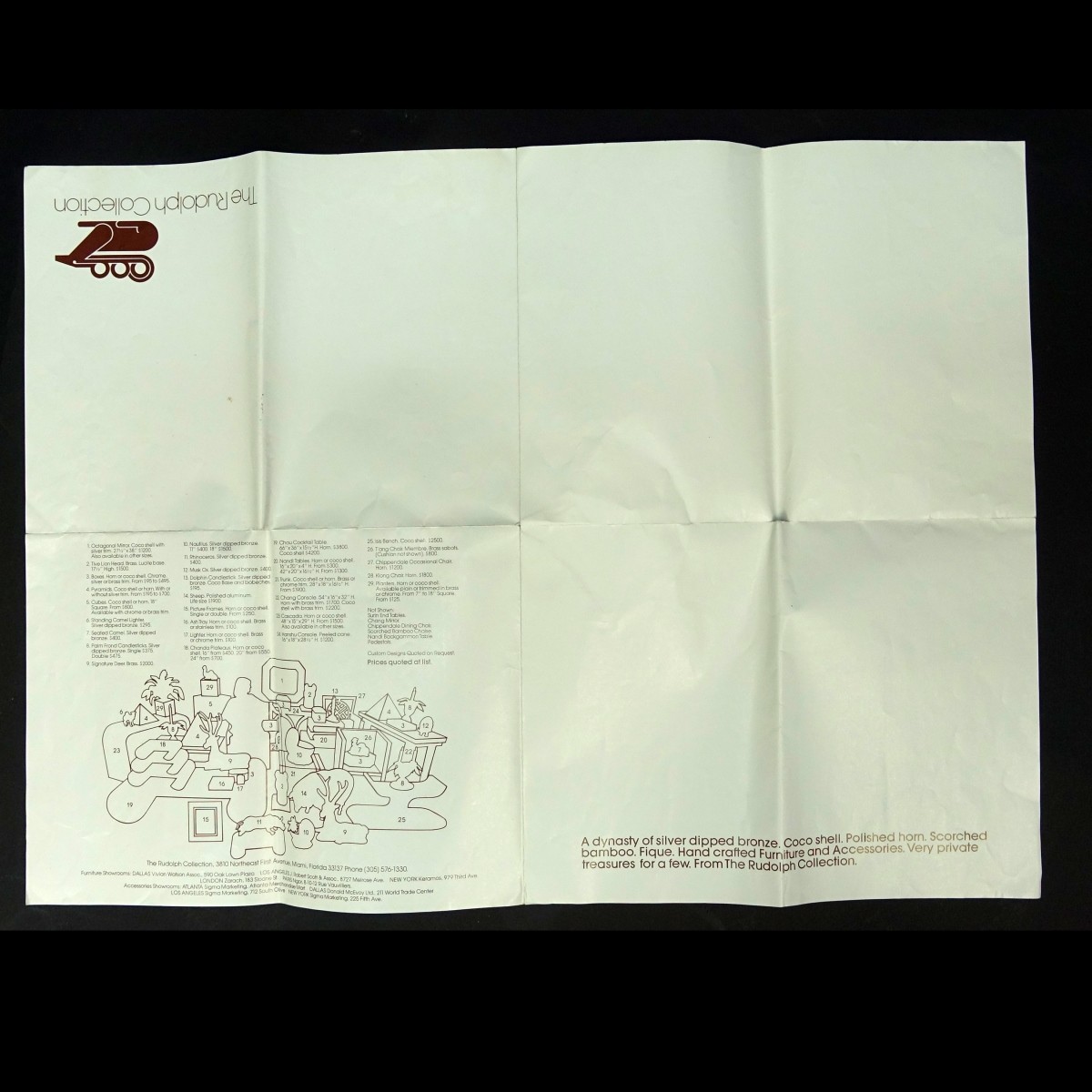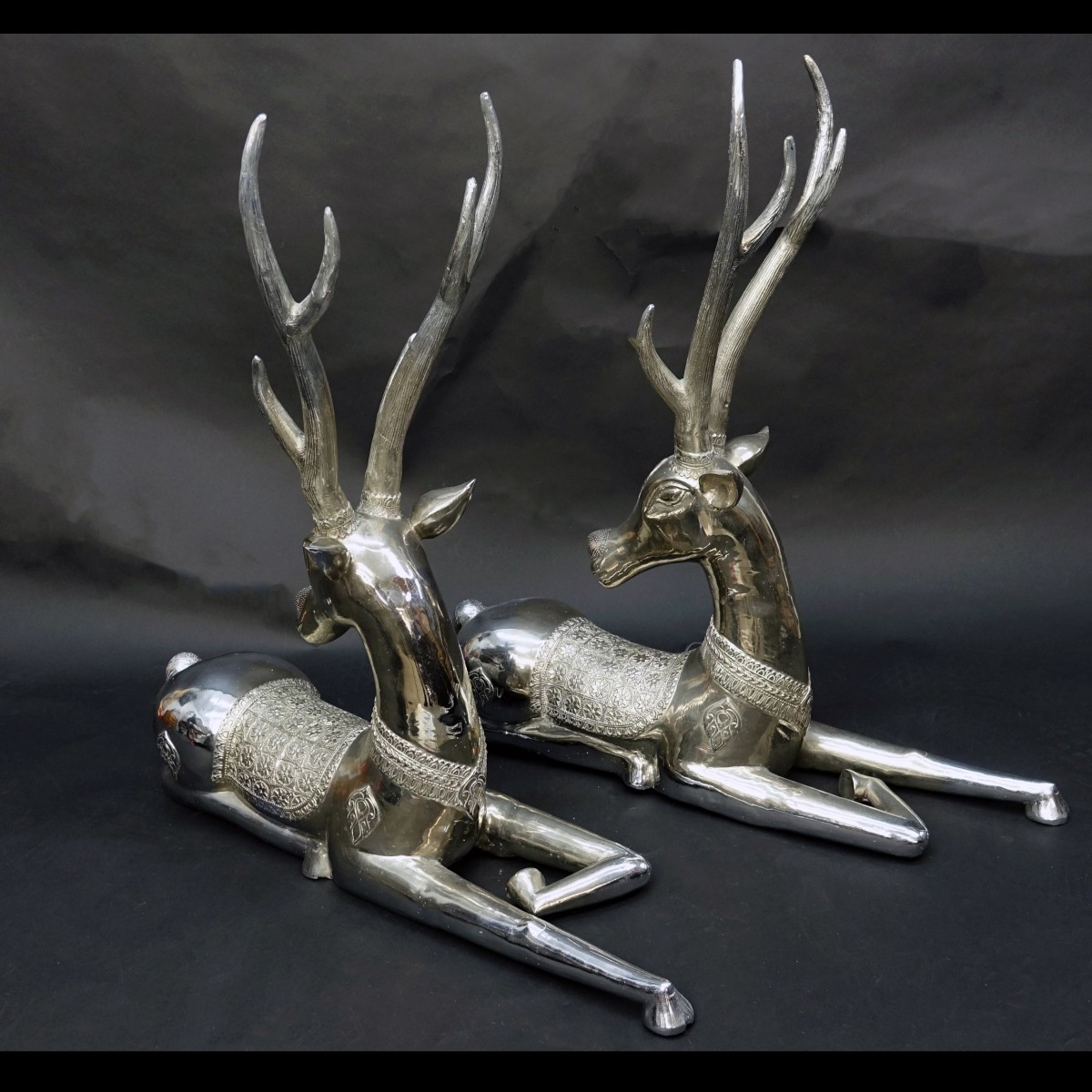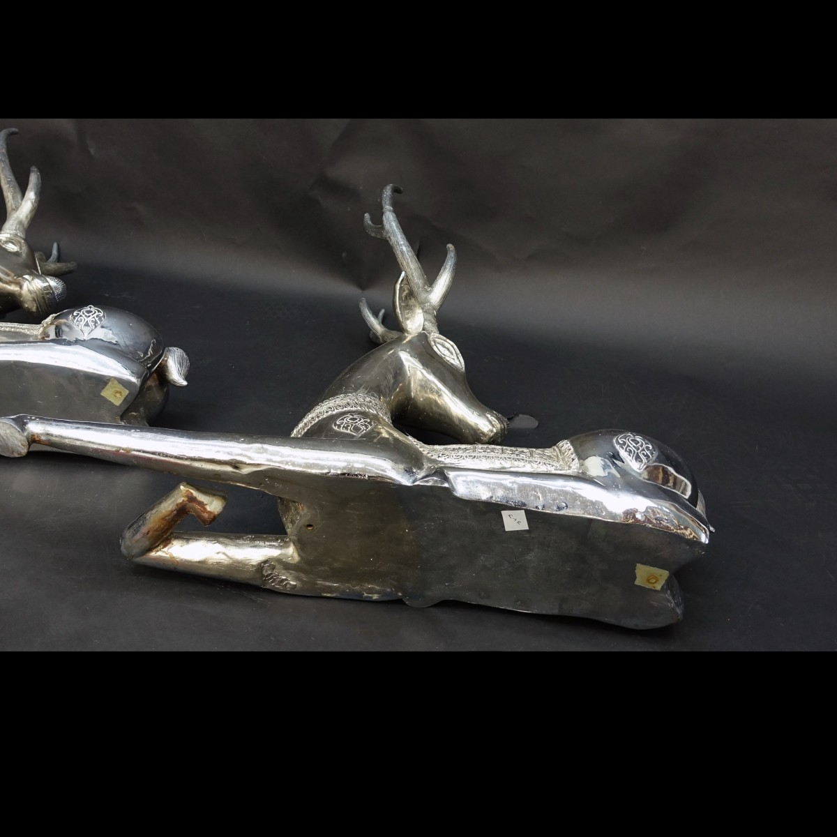 Pair of Vintage Large Silvered Metal Reclining Deer Sculptures From The Rudolph Collection, Miami. Measures 31-1/8" H x 30" L. Original brochure included. Condition: Rubbing, light pitting, otherwise good condition Estimate: $600.00 - $800.00 Domestic Shipping: Third party