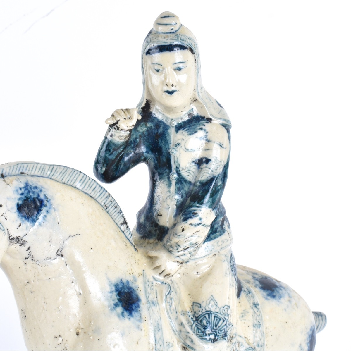 Chinese Tang Style Blue and White Porcelain Female Rider on Horseback. Measures 16" H x 13" W. Condition: Rubbing otherwise good condition Estimate: $100.00 - $150.00 Domestic Shipping: Third party