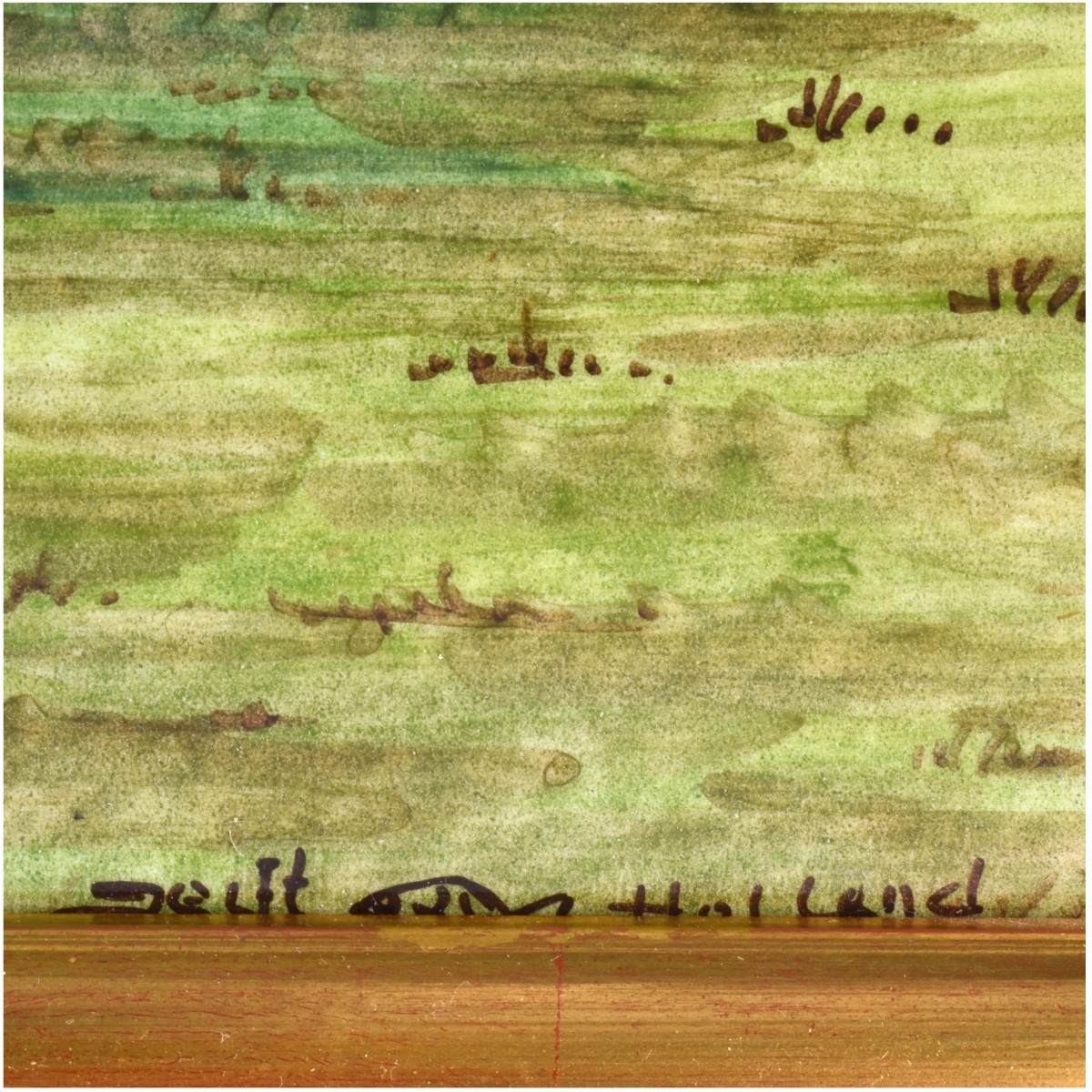 Vintage Hand Painted Delftware Porcelain Tiles as Plaque, Signed Lower Right. Depicts a Holland windmill and boat scene. Frame measures 13-3/4" H x 19-7/8" W. Condition: Good condition Estimate: $100.00 - $200.00 Domestic Shipping: Third party