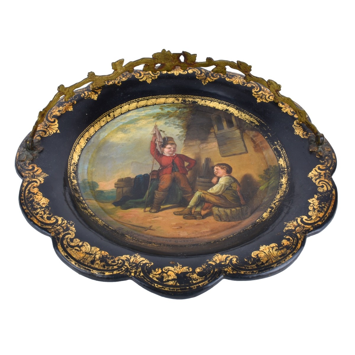 Antique English Black Lacquered Papier Mache Plate with Gilt Brass Handle. Portrait to center depicting young boys inscribed "Who will serve the queen" lower. Measures 11" Dia. Condition: Rubbing to gilt Estimate: $50.00 - $100.00 Domestic Shipping: $52.00