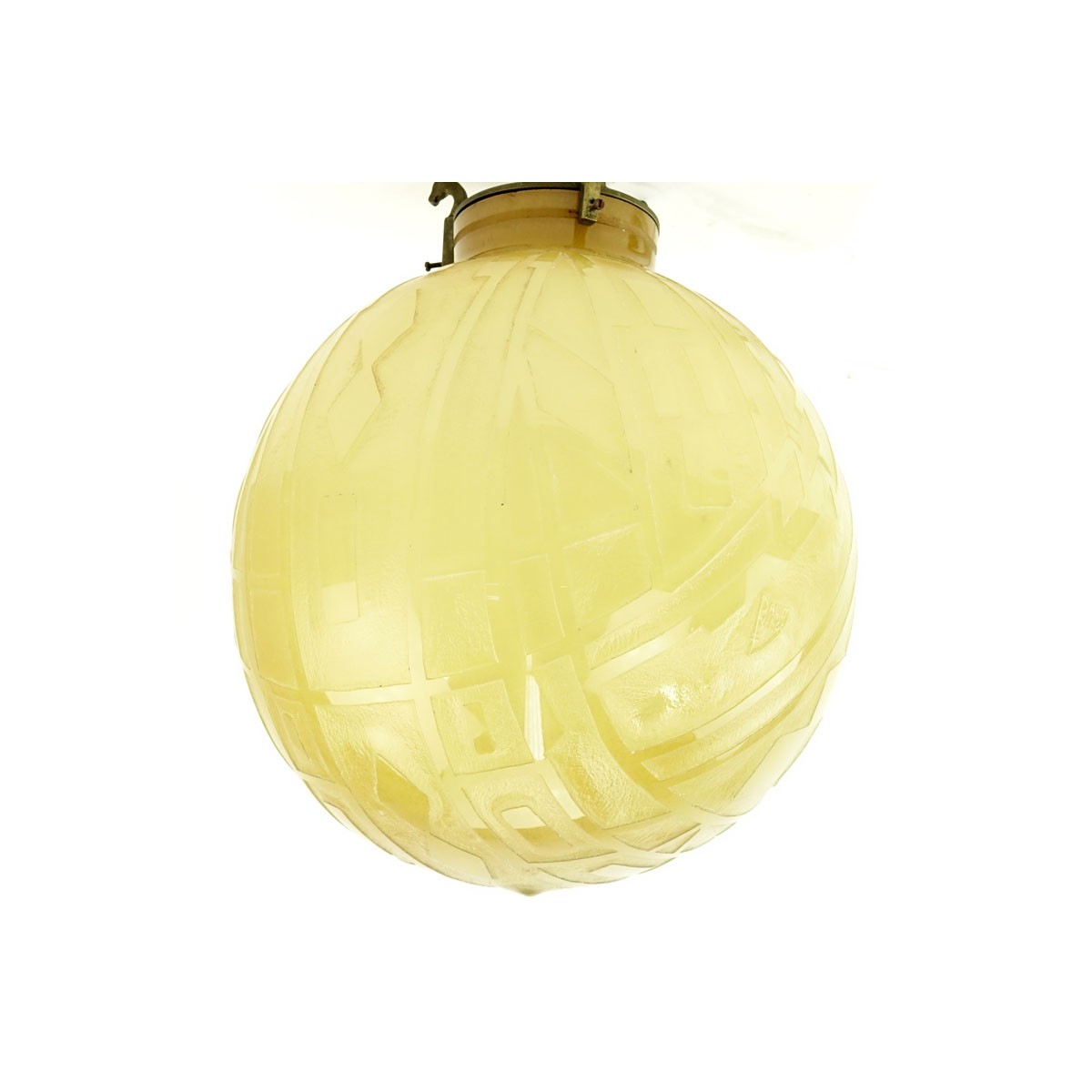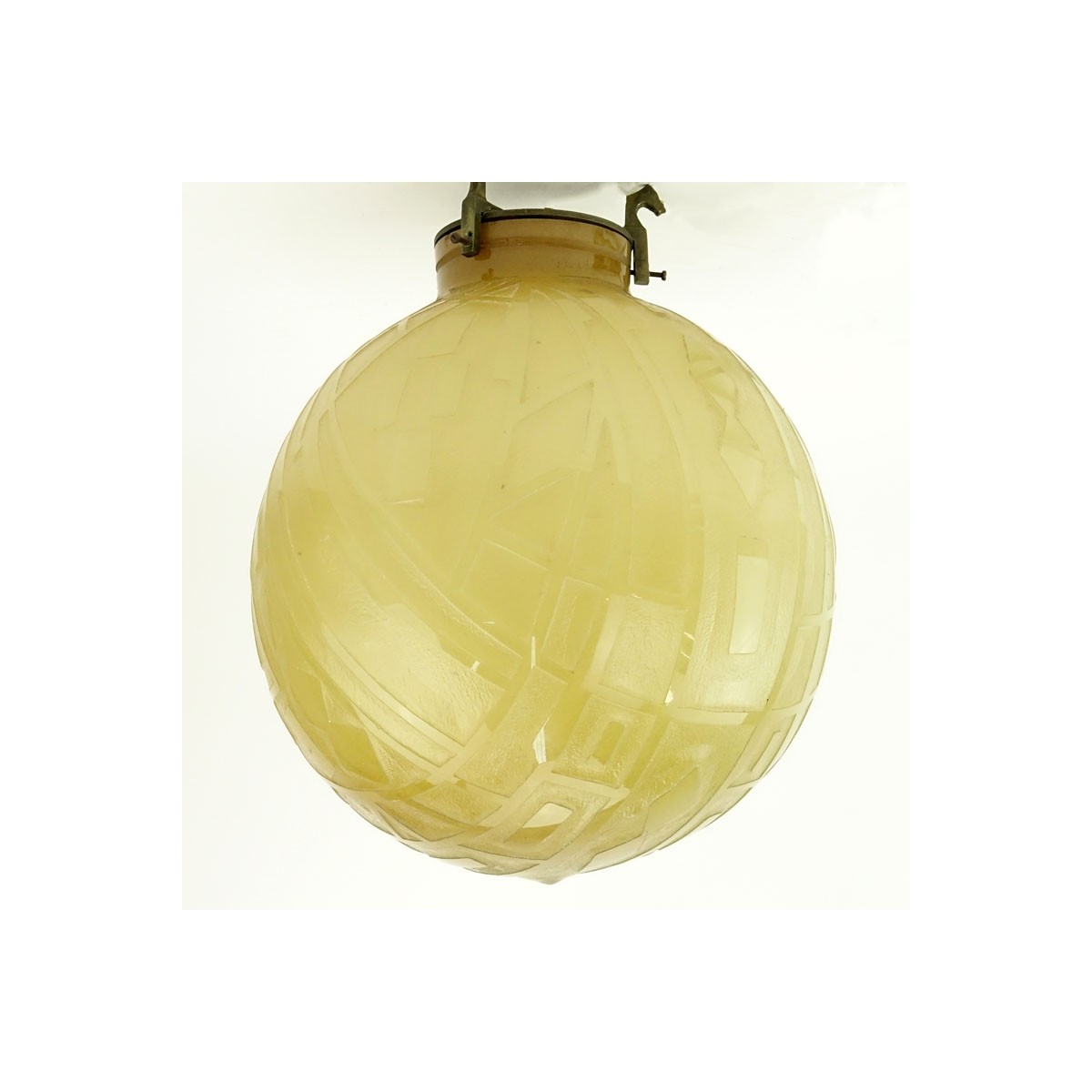 Daum Nancy French Art Deco Pendant Light Chandelier. Signed "Daum Nancy". Pale amber color globe shade with molded intricate patterns hanging from bronze hardware. Few small nicks to top where hardware is affixed. Globe measures 14-1/2" H x 11-1/2" Dia. (estimate $800-$1000) Shipping: Third party.