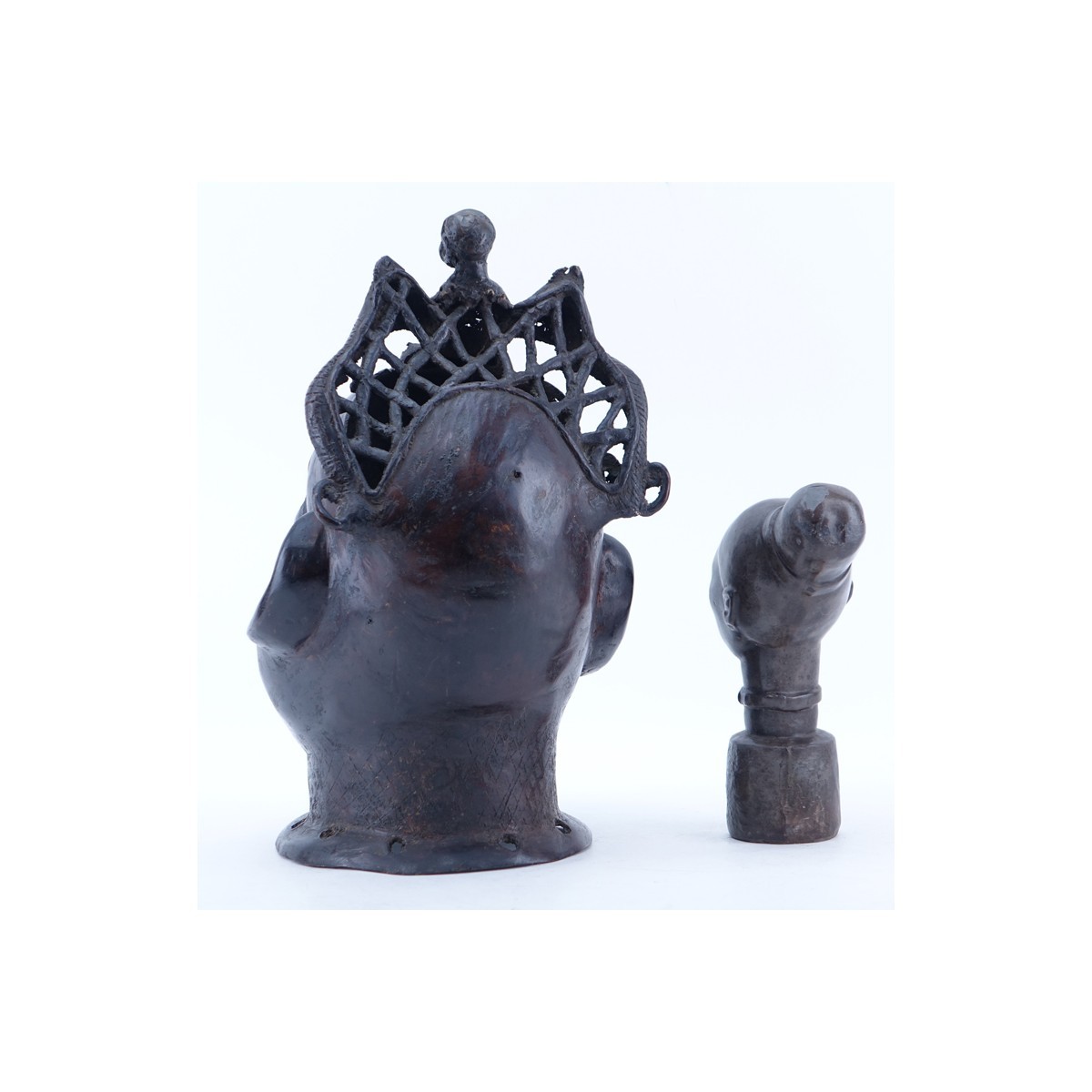 Group of Two (2): African Bronze Sculpture and a Stoneware Sculpture, Each 20th C. Heads of Benin.