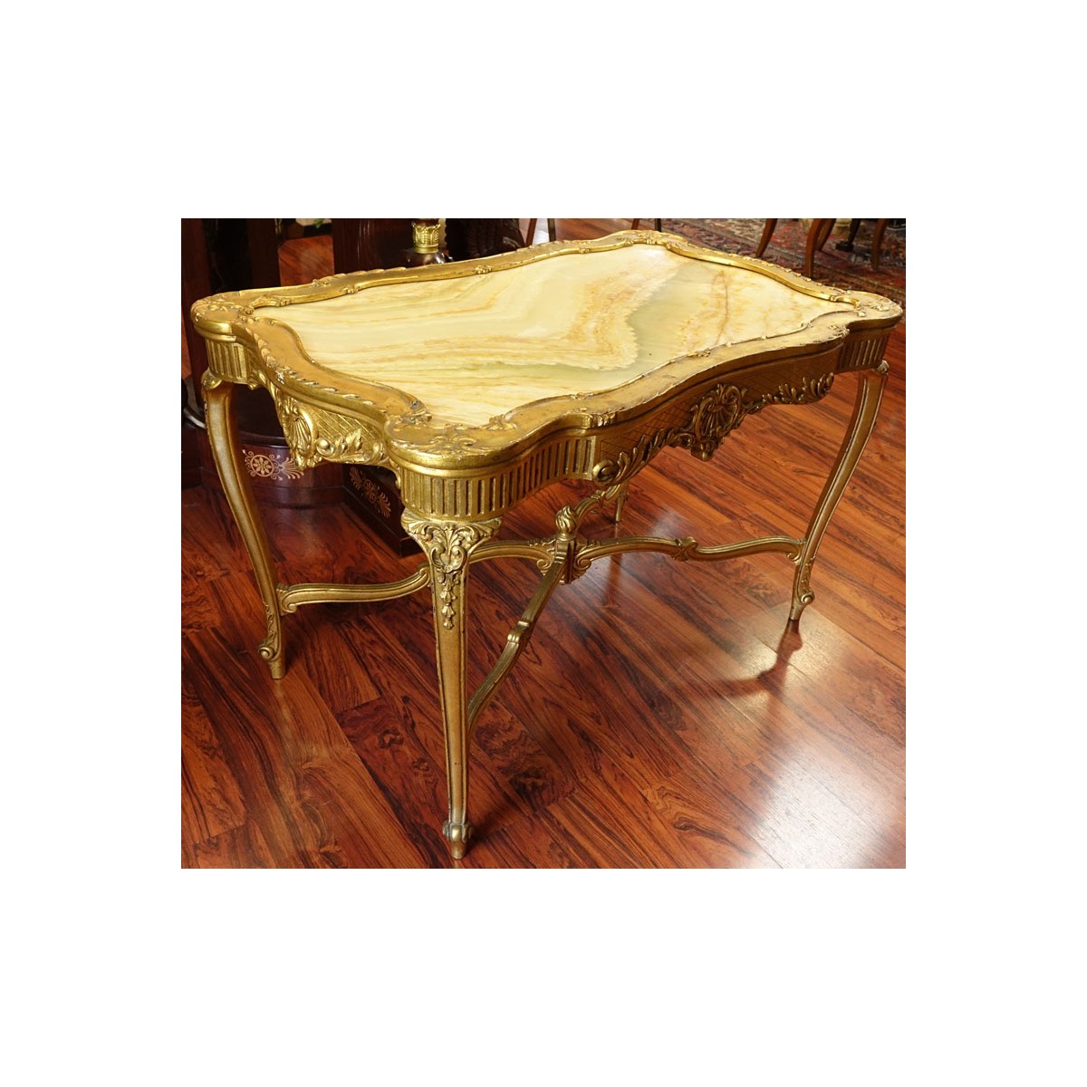 Early 20th Century Carved and Gilt Wood Center Table with Onyx Top. Decorated with carved scroll mo