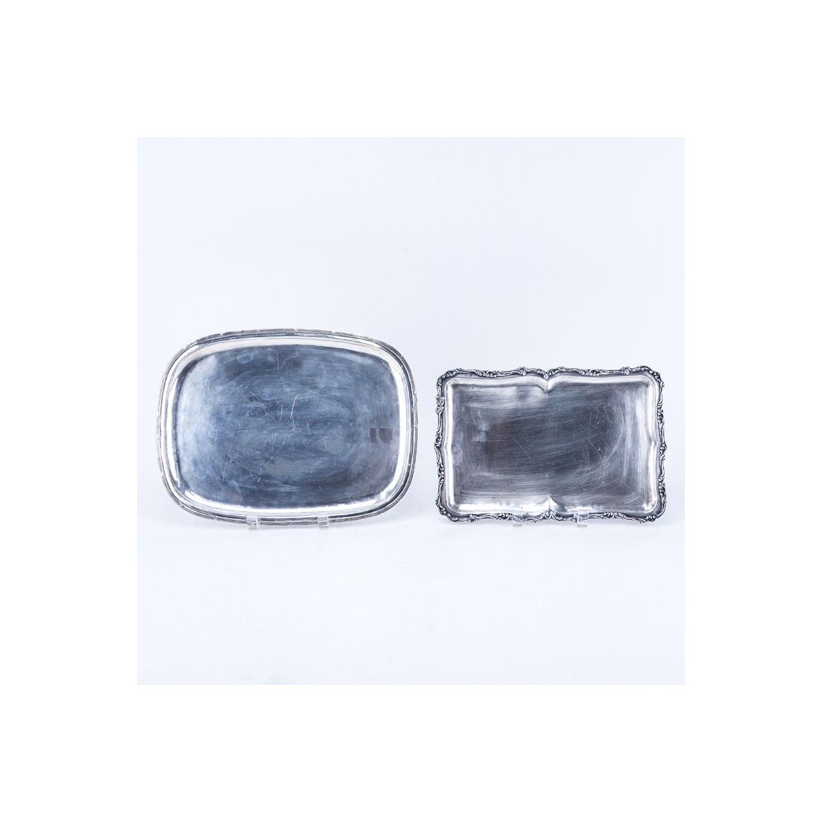 Two (2) 900 Silver Trays. Signed 900. Light surface scratches. Measures 8-1/4" x 12-1/8" and 13-3/4" x 10-3/8" total weight approx. 40.19 troy ounces. Shipping $62.00 (estimate $450-$650)
