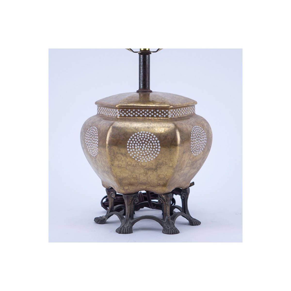 Vintage Chinese Style Gilt Porcelain Lamp mounted on Metal Base. Rubbing to gilt. Measures 23-1/4"
