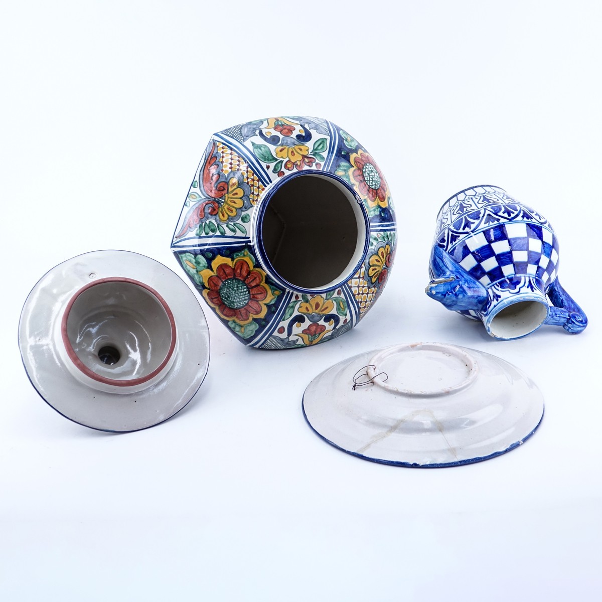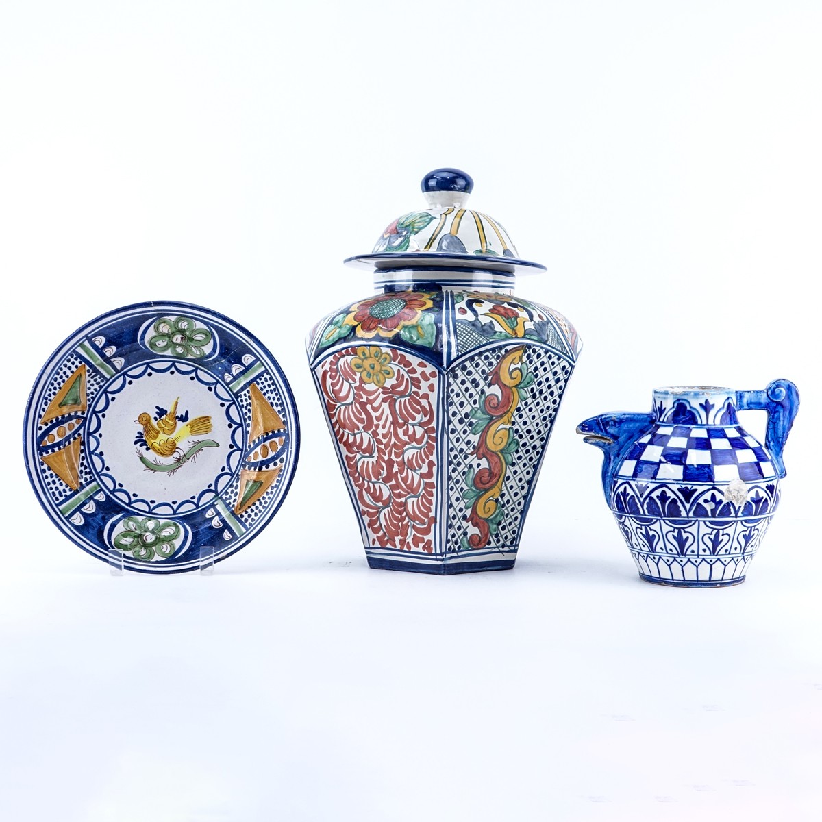 Grouping of Three (3): Large Mexican Faience Pottery Covered Jar, Faience Pottery Cabinet Plate, and Faience Pottery Pitcher. Covered jar is signed others are unsigned. Plate is in "As Is" condition, pitcher has a few nicks to rim and losses to paint. Jar measures 16-1/2" H, plate measures 10-5/8" Dia. (estimate $50-$150) Shipping: Third party.