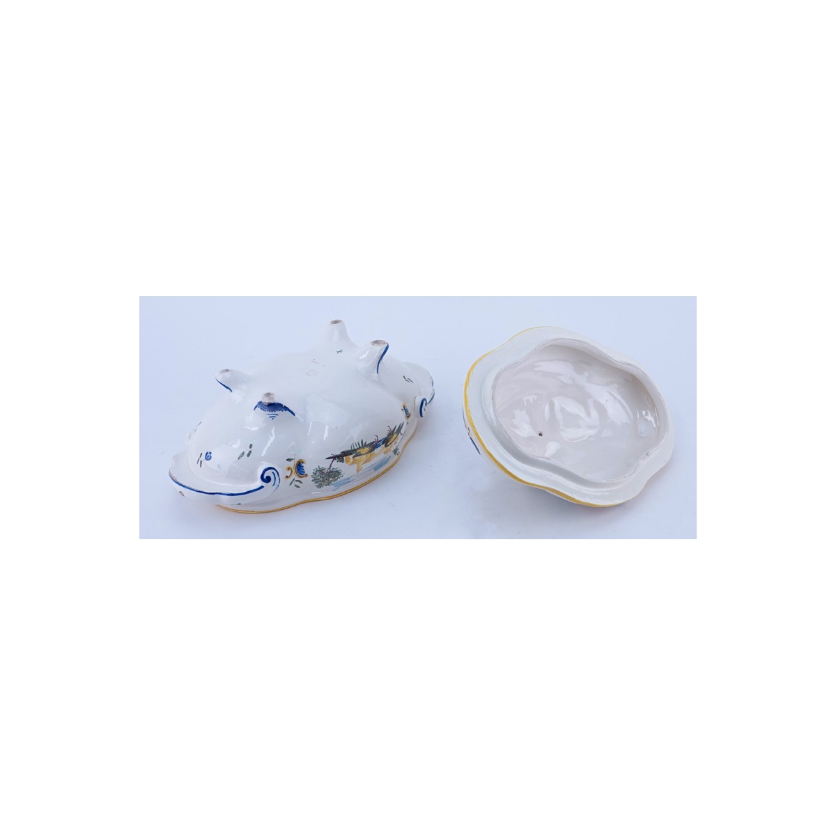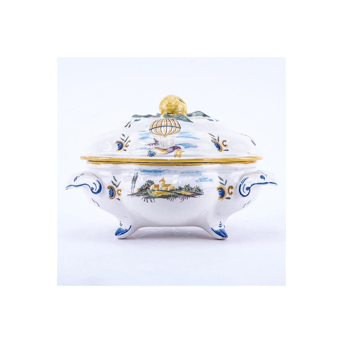A French Faience Pottery Covered Tureen. Signed. Typical crackle to glaze, possible repair to finial otherwise good condition. Measures 9-1/2" H x 13-3/8" W x 8-1/4" D. (estimate $25-$50) Shipping $95.00