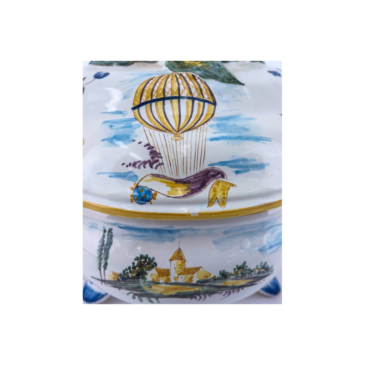 A French Faience Pottery Covered Tureen. Signed. Typical crackle to glaze, possible repair to finia