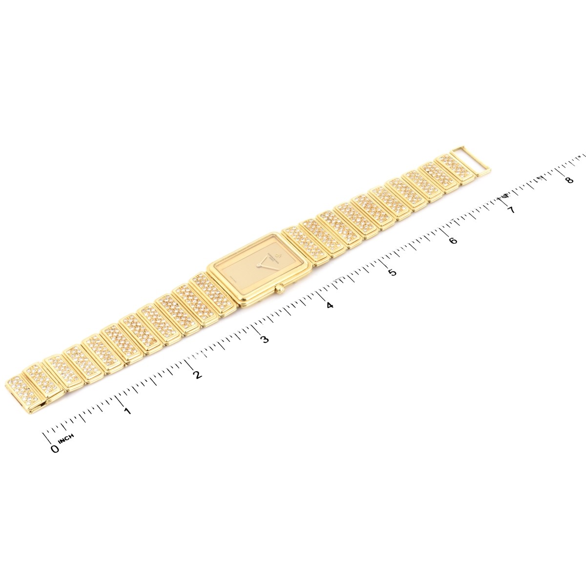 Vintage Vacheron Constantin Harmony Pave Set Diamond and 18 Karat Yellow Gold Bracelet Watch with Quartz Movement. Signed, stamped 750, numbered 568001. Case measures 28mm x 22mm; bracelet measures 7-1/4" L. Approx. weight: 110.7 grams. Condition: Good vintage condition. Surface wear from normal use. Likely needs a battery. Please note the gallery does not warranty the running condition of watches. Estimate: $9000.00 - $12000.00 Domestic Shipping: $32.00