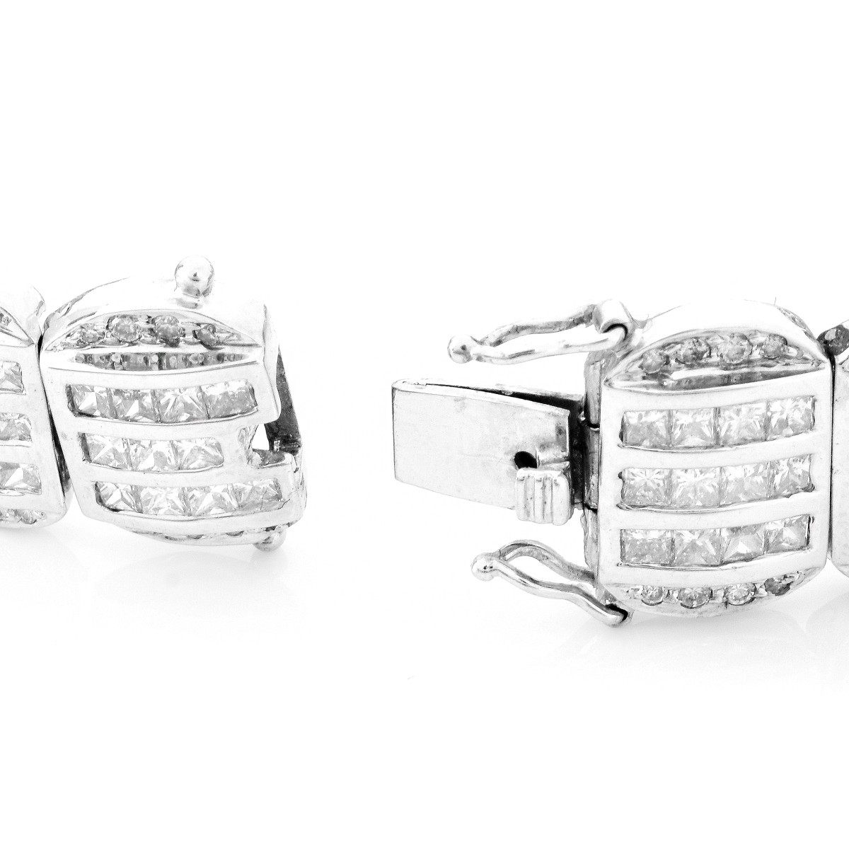 Approx. 13.50 Carat TW Invisible Set Princess Cut Diamond, Round Brilliant Cut Diamond and 18 Karat White Gold Bracelet. Diamonds H-I color, VS10SI1 clarity. Stamped 750 18K. Measures 7-1/8" L, 1/2" W. Approx. weight: 31.7 grams. Condition: Very good condition. Estimate: $5500.00 - $7500.00 Domestic Shipping: $32.00