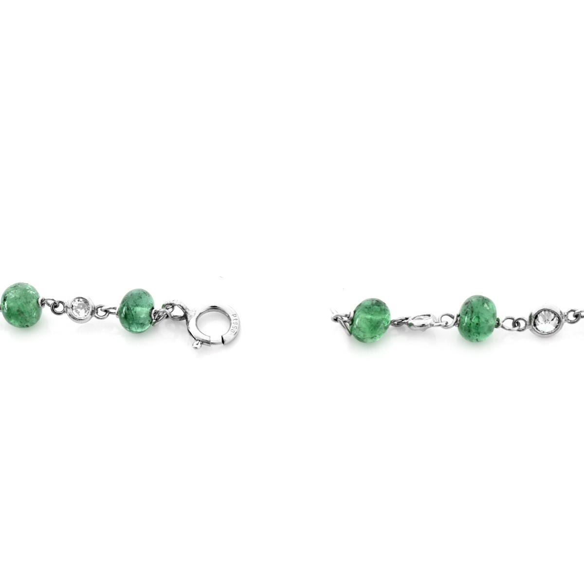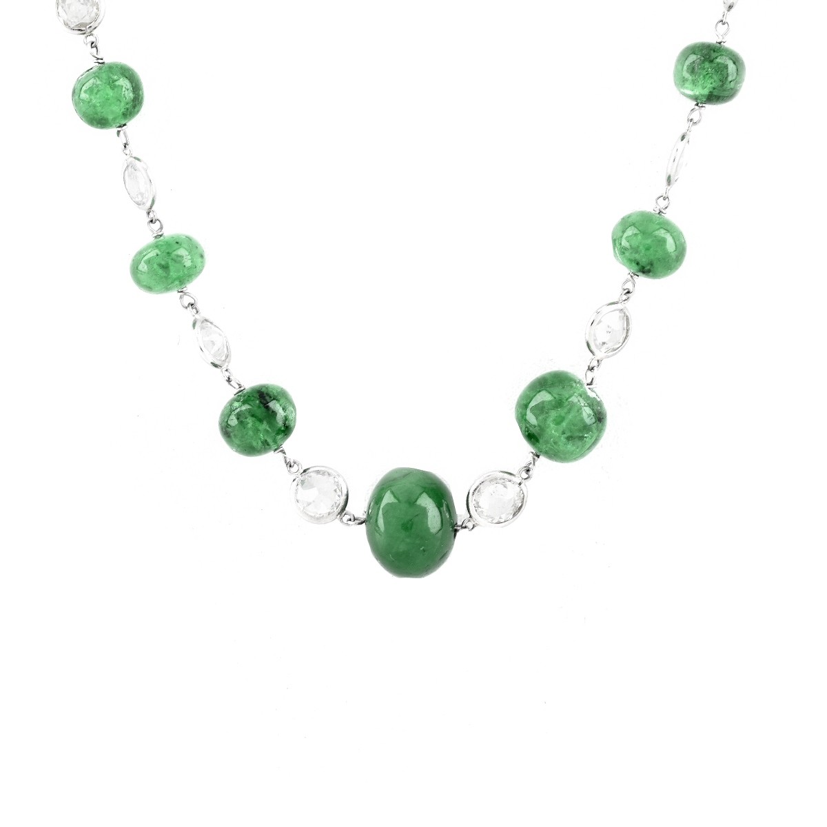 Approx. 100.0 Carat TW Graduated Emerald Bead, 20.0 Carat TW Old European Cut Diamond and Platinum 62" Long Necklace. Emeralds range from 4mm-10mm. Approx. weight: 35.6 grams. Condition: Very good condition. Estimate: $14000.00 - $18000.00 Domestic Shipping: $32.00
