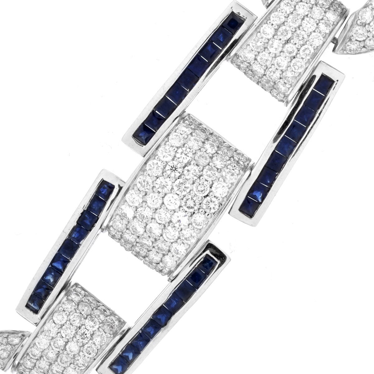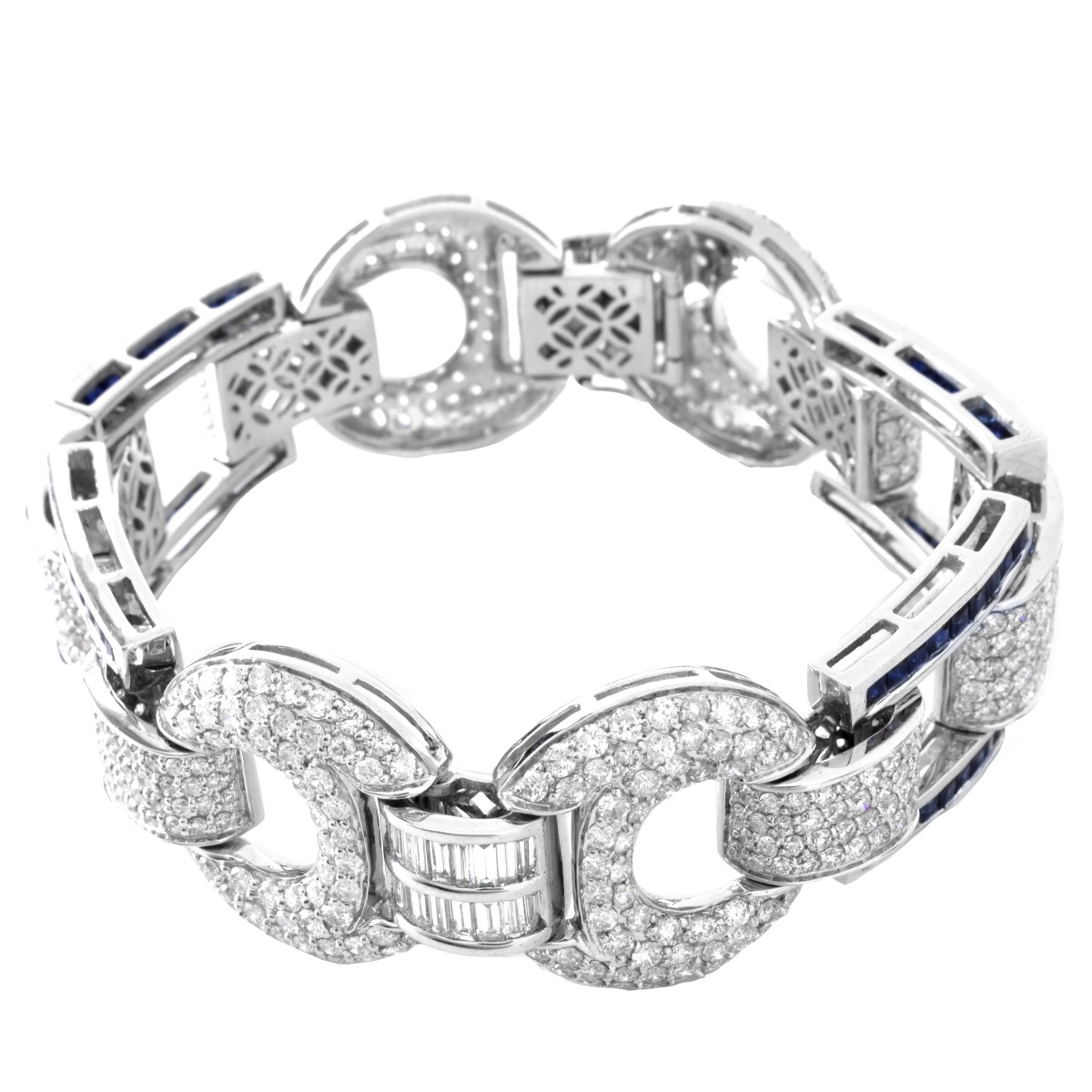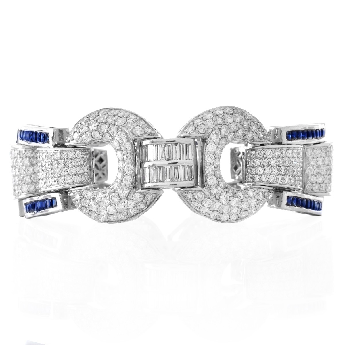 Approx. 18.0 Carat TW Pave Set Round Brilliant Cut Diamond and Baguette Cut Diamond, Sapphire and 18 Karat White Gold Link Bracelet. Diamonds G-H color, VS2-SI1 clarity. Stamped 18K. Measures 7-3/4 L, 7/8" W. Approx. weight: 78.1 grams. Condition: Very good condition. Estimate: $16000.00 - $20000.00 Domestic Shipping: $32.00
