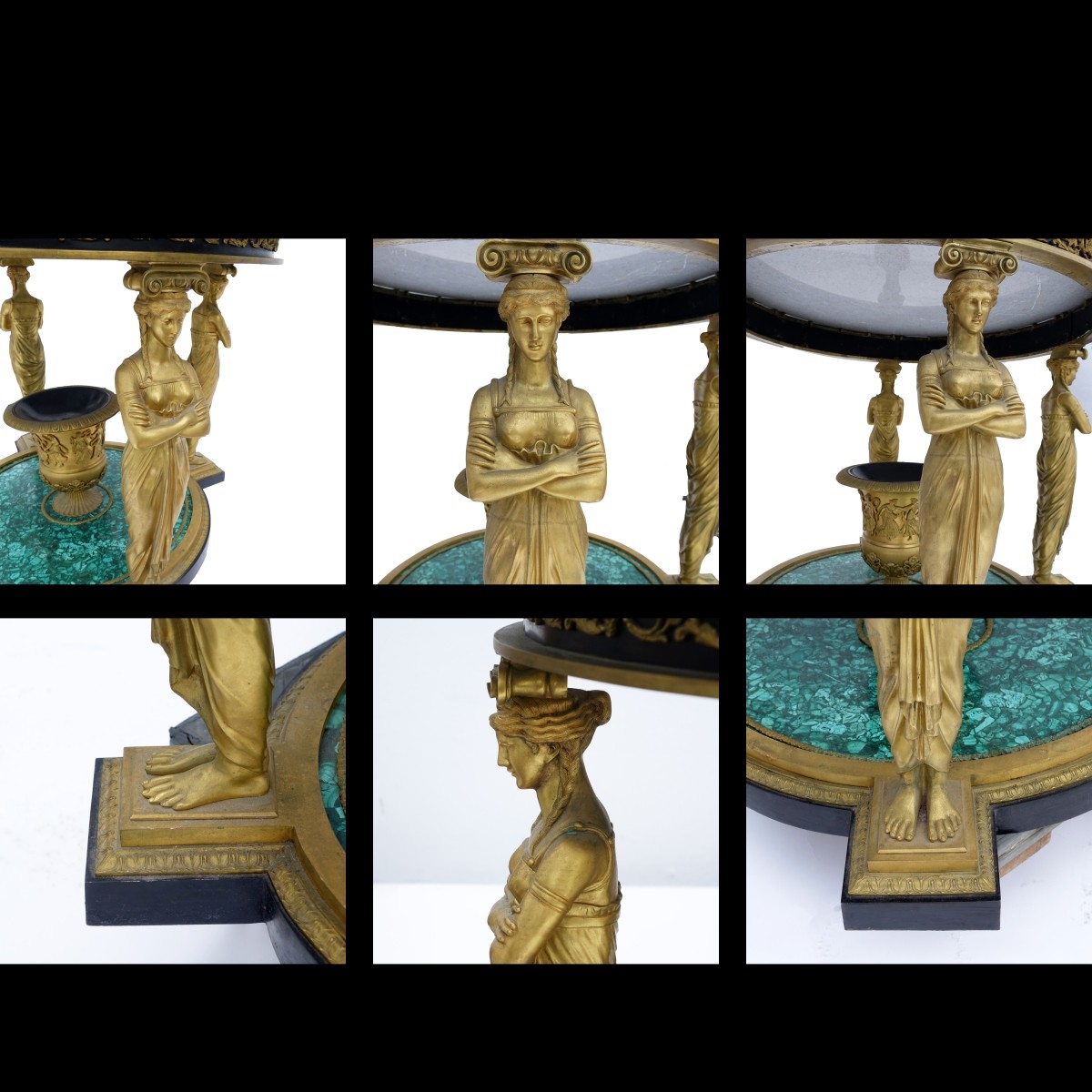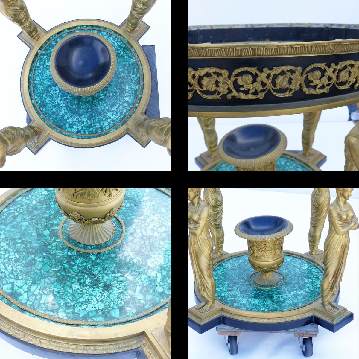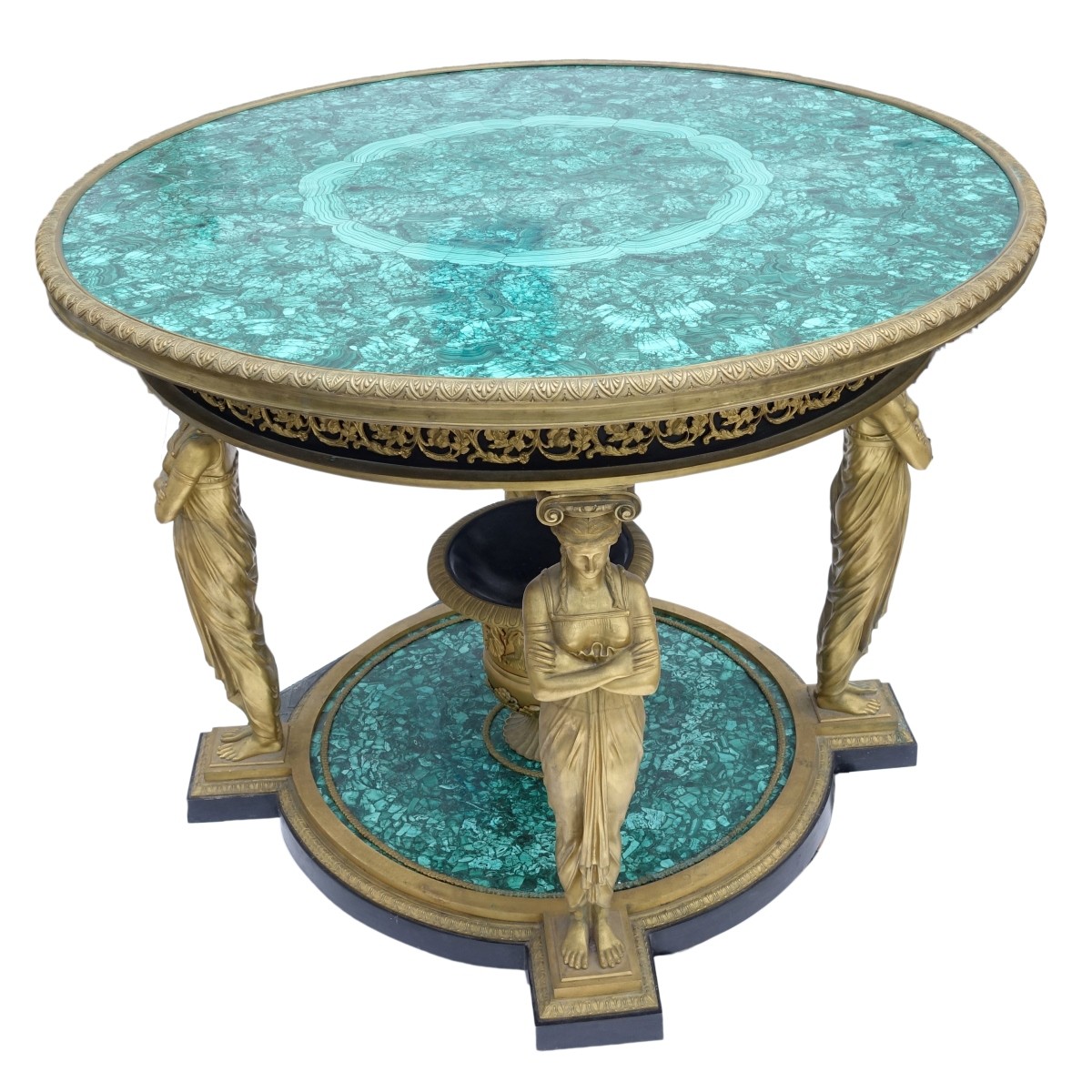 A Magnificent Early 20th Century Empire Style Gilt Bronze and Malachite Round Center Table. Top supported by four classical figures, acanthus leaves accents to bronze, urn vase on lower stretcher, possibly Russian malachite. Measures 33-1/4" H x 44" dia. Condition: Typical oxidation to bronze, rubbing otherwise good condition Estimate: $40,000.00 - $60,000.00 Domestic Shipping: Third party
