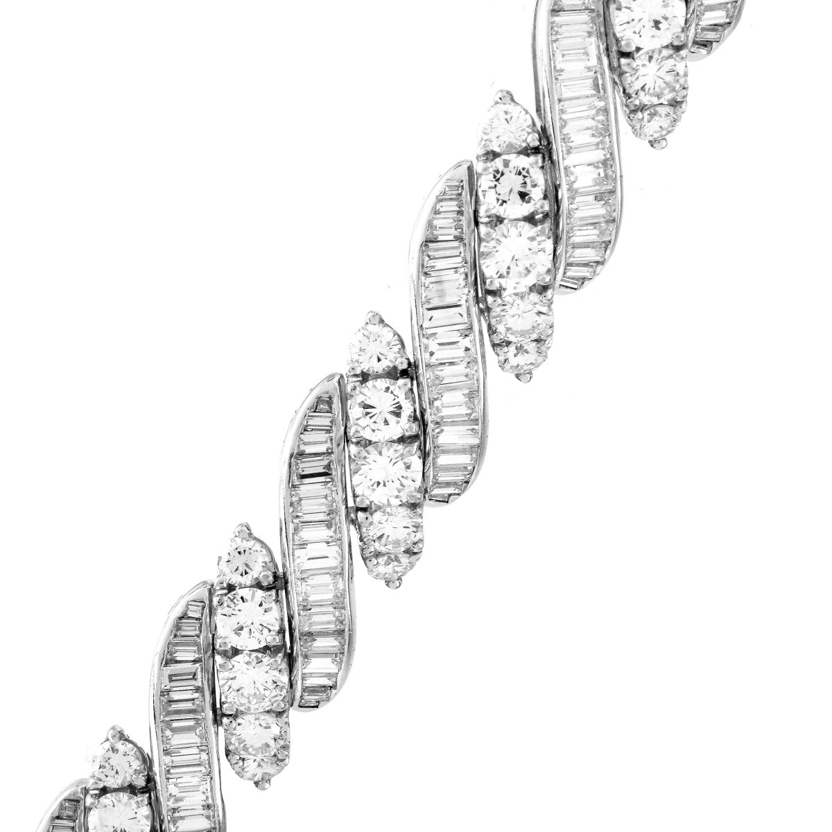 Vintage Approx. 22.0 Carat Round Brilliant and Baguette Cut Diamond and Platinum Bracelet. Diamonds D-E color, VVS-VS clarity. Measures 7-3/4" L, 3/8" W. Approx. weight: 52.40 grams. Condition: Very good vintage condition. Estimate: $16000.00 - $20000.00 Domestic Shipping: $30.00