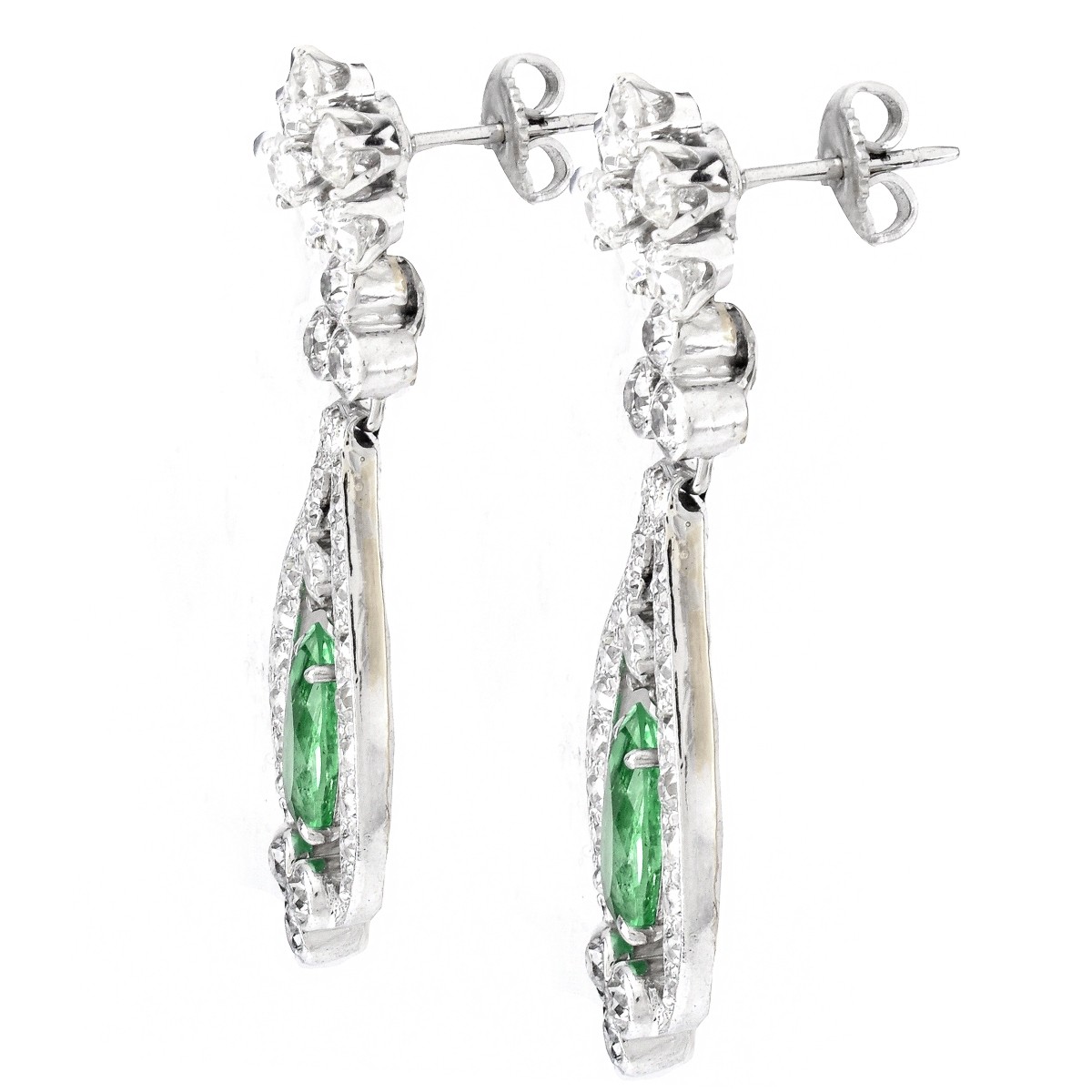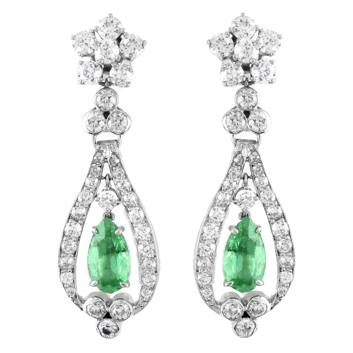 Antique Approx. 3.50 Carat Pear Shape Emerald, 6.0 Carat Old European Cut Diamond and Platinum Pendant Earrings, Emeralds with vivid saturation of color. Diamonds E-F color, VVS-VS clarity. Measure 2" L, 5/8" W. Approx. weight: 15.4 grams. Condition: Very good condition. Estimate: $8000.00 - $12000.00 Domestic Shipping: $30.00